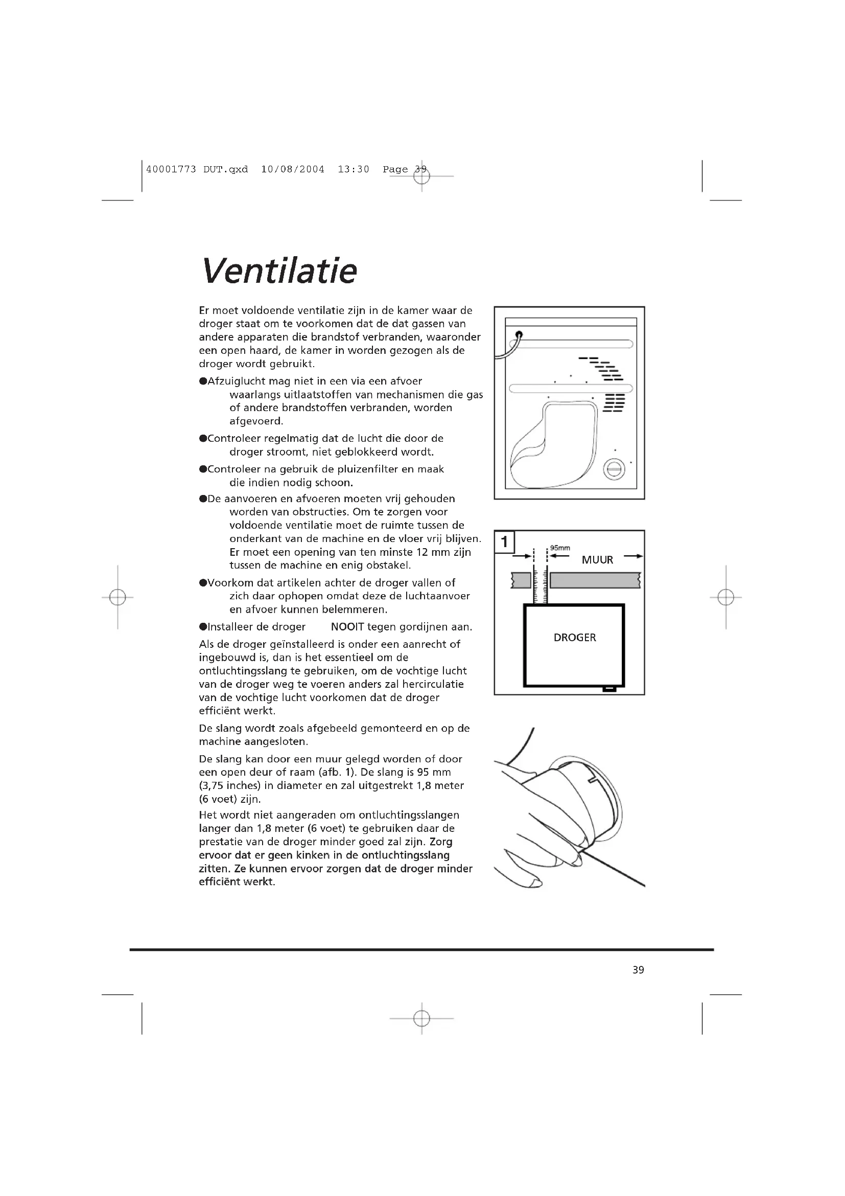 IInnssttaallllaattiiee IInnddiieenn hheett pprroobblleeeemm mmeett uuww mmaacchhiinnee wwoorrddtt vveerroooorrzzaaaakktt ddoooorr eeeenn vveerrkkeeeerrddee iinnssttaallllaattiiee,, kkuunnnneenn ddee kkoosstteenn vvaann ddee oonnddeerrhhoouuddssbbeeuurrtt aaaann uu wwoorrddeenn ddoooorrbbeerreekkeenndd.. AAllss ddee ssttrroooommkkaabbeell vvaann hheett ttooeesstteell bbeesscchhaaddiiggdd iiss,, ddaann mmooeett hhiijj vveerrvvaannggeenn wwoorrddeenn ddoooorr eeeenn ssppeecciiaaaall ssnnooeerr ddaatt AALLLLEEEENN bbiijj ddee ddiieennsstt RReesseerrvveeoonnddeelleenn vvaann GGIIAASS vveerrkkrriijjggbbaaaarr iiss.. DDee kkaabbeell mmooeett ddoooorr eeeenn bbeekkwwaaaamm ppeerrssoooonn wwoorrddeenn ggeeïïnnssttaalllleeeerrdd.. SSlluuiitt ddee mmaacchhiinnee nniieett aaaann eenn ssttaarrtt ddeezzee nniieett vvoooorrddaatt ddee iinnssttaallllaattiiee iiss vvoollttooooiidd.. VVoooorr uuww vveeiilliigghheeiidd mmooeett ddeezzee ddrrooggeerr oopp ddee jjuuiissttee mmaanniieerr wwoorrddeenn ggeeïïnnssttaalllleeeerrdd.. AAllss eerr ooookk mmaaaarr eenniiggee ttwwiijjffeell bbeessttaaaatt oovveerr ddee iinnssttaallllaattiiee,, bbeell ddaann ddee GGIIAASS--SSeerrvviiccee vvoooorr aaddvviieess.. 40001773 DUT.qxd 10/08/2004 13:30 Page 38Er moet voldoende ventilatie zijn in de kamer waar de droger staat om te voorkomen dat de dat gassen van andere apparaten die brandstof verbranden, waaronder een open haard, de kamer in worden gezogen als de droger wordt gebruikt. ● Afzuiglucht mag niet in een via een afvoer waarlangs uitlaatstoffen van mechanismen die gas of andere brandstoffen verbranden, worden afgevoerd. ● Controleer regelmatig dat de lucht die door de droger stroomt, niet geblokkeerd wordt. ● Controleer na gebruik de pluizenfilter en maak die indien nodig schoon. ● De aanvoeren en afvoeren moeten vrij gehouden worden van obstructies. Om te zorgen voor voldoende ventilatie moet de ruimte tussen de onderkant van de machine en de vloer vrij blijven. Er moet een opening van ten minste 12 mm zijn tussen de machine en enig obstakel. ● Voorkom dat artikelen achter de droger vallen of zich daar ophopen omdat deze de luchtaanvoer en afvoer kunnen belemmeren. ● Installeer de droger NNOOOOIITT tegen gordijnen aan. Als de droger geïnstalleerd is onder een aanrecht of ingebouwd is, dan is het essentieel om de ontluchtingsslang te gebruiken, om de vochtige lucht van de droger weg te voeren anders zal hercirculatie van de vochtige lucht voorkomen dat de droger efficiënt werkt. De slang wordt zoals afgebeeld gemonteerd en op de machine aangesloten. De slang kan door een muur gelegd worden of door een open deur of raam (afb. 1). De slang is 95 mm (3,75 inches) in diameter en zal uitgestrekt 1,8 meter (6 voet) zijn. Het wordt niet aangeraden om ontluchtingsslangen langer dan 1,8 meter (6 voet) te gebruiken daar de prestatie van de droger minder goed zal zijn. ZZoorrgg eerrvvoooorr ddaatt eerr ggeeeenn kkiinnkkeenn iinn ddee oonnttlluucchhttiinnggssssllaanngg zziitttteenn.. ZZee kkuunnnneenn eerrvvoooorr zzoorrggeenn ddaatt ddee ddrrooggeerr mmiinnddeerr eeffffiicciiëënntt wweerrkktt..