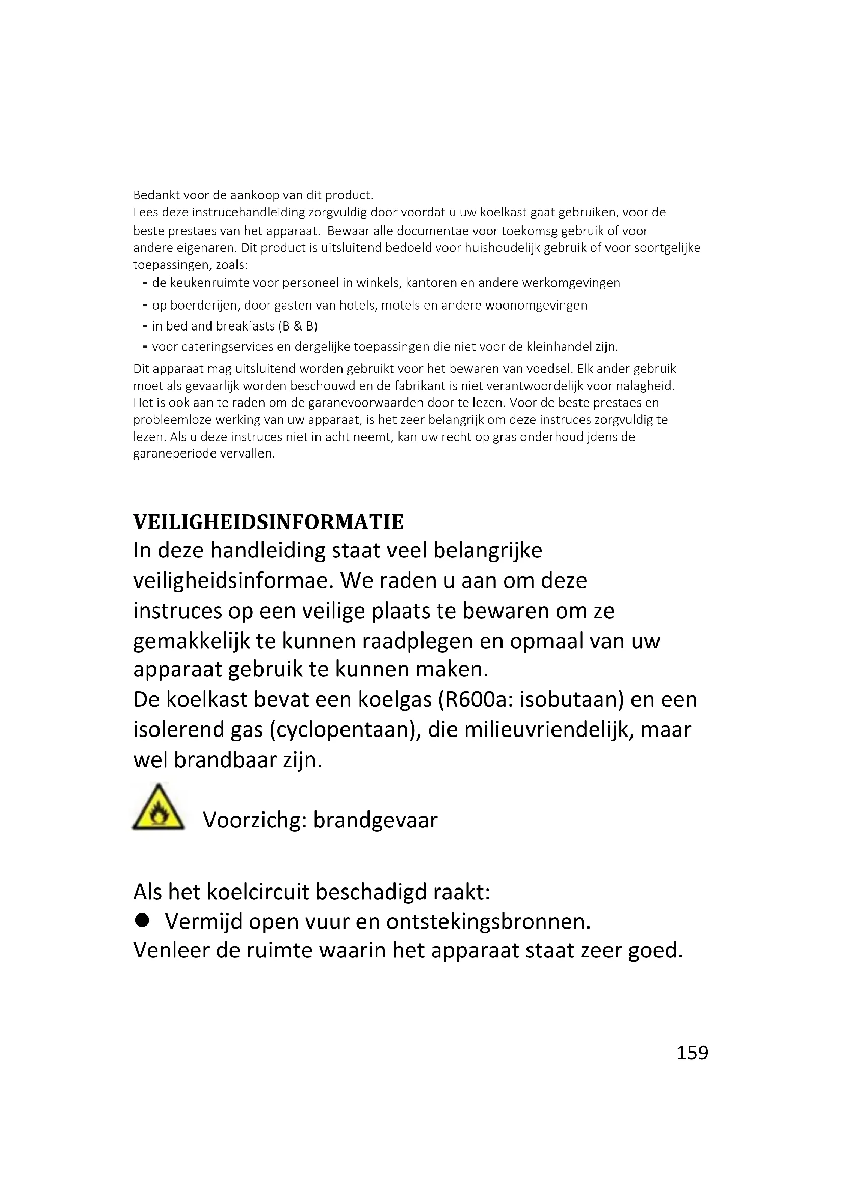 Bedankt voor de aankoop van dit product. Lees deze instructiehandleiding zorgvuldig door voordat u uw koelkast gaat gebruiken, voor de beste prestaties van het apparaat. Bewaar alle documentatie voor toekomstig gebruik of voor andere eigenaren. Dit product is uitsluitend bedoeld voor huishoudelijk gebruik of voor soortgelijke toepassingen, zoals: - de keukenruimte voor personeel in winkels, kantoren en andere werkomgevingen - op boerderijen, door gasten van hotels, motels en andere woonomgevingen - in bed and breakfasts (B & B) - voor cateringservices en dergelijke toepassingen die niet voor de kleinhandel zijn. Dit apparaat mag uitsluitend worden gebruikt voor het bewaren van voedsel. Elk ander gebruik moet als gevaarlijk worden beschouwd en de fabrikant is niet verantwoordelijk voor nalatigheid. Het is ook aan te raden om de garantievoorwaarden door te lezen. Voor de beste prestaties en probleemloze werking van uw apparaat, is het zeer belangrijk om deze instructies zorgvuldig te lezen. Als u deze instructies niet in acht neemt, kan uw recht op gratis onderhoud tijdens de garantieperiode vervallen. VEILIGHEIDSINFORMATIE In deze handleiding staat veel belangrijke veiligheidsinformatie. We raden u aan om deze instructies op een veilige plaats te bewaren om ze gemakkelijk te kunnen raadplegen en optimaal van uw apparaat gebruik te kunnen maken. De koelkast bevat een koelgas (R600a: isobutaan) en een isolerend gas (cyclopentaan), die milieuvriendelijk, maar wel brandbaar zijn. Voorzichtig: brandgevaar Als het koelcircuit beschadigd raakt: Vermijd open vuur en ontstekingsbronnen. Ventileer de ruimte waarin het apparaat staat zeer goed. Percentage bedrijfstijd:160 WAARSCHUWING! Wees bij het reinigen/verplaatsen van het apparaat voorzichtig om de metalen condensatordraden aan de achterkant van het apparaat niet aan te raken, omdat u daardoor uw vingers en handen kunt verwonden of uw product kunt beschadigen. Dit apparaat is niet ontworpen om op andere apparaten te stapelen. Probeer niet op uw apparaat te zitten of te staan, omdat het daar niet voor is ontworpen. U kunt uzelf verwonden of het apparaat beschadigen. Zorg ervoor dat het netsnoer niet beklemd zit onder het apparaat tijdens en na het vervoeren/verplaatsen van het apparaat, om te voorkomen dat het netsnoer doorgesneden of beschadigd raakt. Let bij het plaatsen van uw apparaat goed op om uw vloer, leidingen, wandbekleding enz. niet te beschadigen. Verplaats het apparaat niet door het aan het deksel of de handgreep te trekken. Laat kinderen niet met het apparaat spelen of aan de bedieningselementen komen. Ons bedrijf wijst alle aansprakelijkheid van de hand als de instructies niet worden gevolgd. Installeer het apparaat niet in vochtige, olieachtige of stoffige plaatsen en stel het niet bloot aan direct zonlicht of water.161 Installeer het apparaat niet in de buurt van verwarmingsapparaten of ontvlambare materialen. Open het deksel niet als er een stroomstoring is. Als de storing korter dan 20 uur duurt, zou deze geen effect moeten hebben op bevroren voedsel. Als de storing langer duurt, moet het voedsel worden gecontroleerd en onmiddellijk worden geconsumeerd of bereid en daarna opnieuw ingevroren. Maakt u zich geen zorgen als het deksel van de diepvrieskist moeilijk te openen is meteen nadat u het heeft gesloten. Dit komt door het drukverschil, dat gewoonlijk na enkele minuten verdwijnt waardoor het deksel gewoon kan worden geopend. Sluit het apparaat niet aan op de elektriciteitsvoorziening voordat alle verpakkingen en transportbeschermers zijn verwijderd. Laat het apparaat minstens 4 uur staan voordat u het aanzet, om de compressorolie te laten stabiliseren na horizontaal transport. Deze vriezer mag alleen worden gebruikt voor het beoogde doel (d.w.z. het bewaren en invriezen van eetbare voedingsmiddelen). Bewaar geen medicijnen of onderzoeksmaterialen in de wijnkoelers. Als er materiaal moet worden opgeslagen waarvoor een strenge controle van de162 opslagtemperatuur vereist is, kan dit bederven of kan er een ongecontroleerde reactie optreden die risico's kan veroorzaken. Haal de stekker uit het stopcontact voordat u handelingen uitvoert. Controleer bij levering of het product niet beschadigd is en of alle onderdelen en accessoires in perfecte staat zijn. Als in het koelsysteem een lek opgemerkt wordt, raak dan de wandcontactdoos niet aan en gebruik geen open vlammen. Open het venster en laat lucht de kamer binnenkomen. Bel vervolgens een servicecentrum en vraag om reparatie. Gebruik geen verlengsnoeren of adapters. Trek niet te hard aan het netsnoer, vouw het niet dubbel en raak de stekker niet met natte handen aan. Beschadig de stekker en/of het netsnoer niet; dit kan elektrische schokken of brand veroorzaken. Plaats geen brandbare en sterk vluchtige materialen zoals ether, benzine, LPG, propaangas, spuitbussen, lijm, pure alcohol, enz. op of in het apparaat. Deze materialen kunnen een explosie veroorzaken. Als het netsnoer van het apparaat is beschadigd, moet het worden vervangen door de fabrikant, diens technische dienst of personen met vergelijkbare kwalificaties, om gevaarlijke situaties163 te voorkomen. Gebruik of bewaar geen ontvlambare sprays, zoals verfbussen in de buurt van de wijnkoelers. Deze kunnen een explosie of brand veroorzaken. Plaats geen voorwerpen en/of houders gevuld met water bovenop het apparaat. We raden het gebruik van verlengsnoeren en multi-adapters niet aan. Verbrand het apparaat niet als u het weg wilt doen. Wees voorzichtig dat u het koelcircuit/de koelleidingen van het apparaat niet beschadigt tijdens het transport en het gebruik. Stel in het geval van schade het apparaat niet bloot aan brand, mogelijke ontstekingsbronnen en ventileer onmiddellijk de ruimte waarin het apparaat staat. Het koelsysteem dat zich achter en binnenin de wijnkoelers bevindt, bevat een koelmiddel. Zorg er daarom voor dat de buizen niet beschadigd raken. Gebruik geen elektrische apparaten in de bewaarruimten voor levensmidde