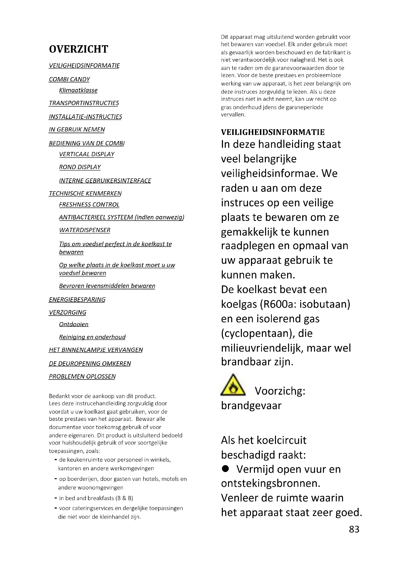 Conformidade Ao colocar a marca neste produto, estamos a confirmar a conformidade com todos os requisitos de segurança, saúde e ambiente relevantes que são aplicáveis na legislação sobre este produto.83 Nederlands OVERZICHT VEILIGHEIDSINFORMATIE COMBI CANDY Klimaatklasse TRANSPORTINSTRUCTIES INSTALLATIE-INSTRUCTIES IN GEBRUIK NEMEN BEDIENING VAN DE COMBI VERTICAAL DISPLAY ROND DISPLAY INTERNE GEBRUIKERSINTERFACE TECHNISCHE KENMERKEN FRESHNESS CONTROL ANTIBACTERIEEL SYSTEEM (indien aanwezig) WATERDISPENSER Tips om voedsel perfect in de koelkast te bewaren Op welke plaats in de koelkast moet u uw voedsel bewaren Bevroren levensmiddelen bewaren ENERGIEBESPARING VERZORGING Ontdooien Reiniging en onderhoud HET BINNENLAMPJE VERVANGEN DE DEUROPENING OMKEREN PROBLEMEN OPLOSSEN Bedankt voor de aankoop van dit product. Lees deze instructiehandleiding zorgvuldig door voordat u uw koelkast gaat gebruiken, voor de beste prestaties van het apparaat. Bewaar alle documentatie voor toekomstig gebruik of voor andere eigenaren. Dit product is uitsluitend bedoeld voor huishoudelijk gebruik of voor soortgelijke toepassingen, zoals: - de keukenruimte voor personeel in winkels, kantoren en andere werkomgevingen - op boerderijen, door gasten van hotels, motels en andere woonomgevingen - in bed and breakfasts (B & B) - voor cateringservices en dergelijke toepassingen die niet voor de kleinhandel zijn. Dit apparaat mag uitsluitend worden gebruikt voor het bewaren van voedsel. Elk ander gebruik moet als gevaarlijk worden beschouwd en de fabrikant is niet verantwoordelijk voor nalatigheid. Het is ook aan te raden om de garantievoorwaarden door te lezen. Voor de beste prestaties en probleemloze werking van uw apparaat, is het zeer belangrijk om deze instructies zorgvuldig te lezen. Als u deze instructies niet in acht neemt, kan uw recht op gratis onderhoud tijdens de garantieperiode vervallen. VEILIGHEIDSINFORMATIE In deze handleiding staat veel belangrijke veiligheidsinformatie. We raden u aan om deze instructies op een veilige plaats te bewaren om ze gemakkelijk te kunnen raadplegen en optimaal van uw apparaat gebruik te kunnen maken. De koelkast bevat een koelgas (R600a: isobutaan) en een isolerend gas (cyclopentaan), die milieuvriendelijk, maar wel brandbaar zijn. Voorzichtig: brandgevaar Als het koelcircuit beschadigd raakt: Vermijd open vuur en ontstekingsbronnen. Ventileer de ruimte waarin het apparaat staat zeer goed.84