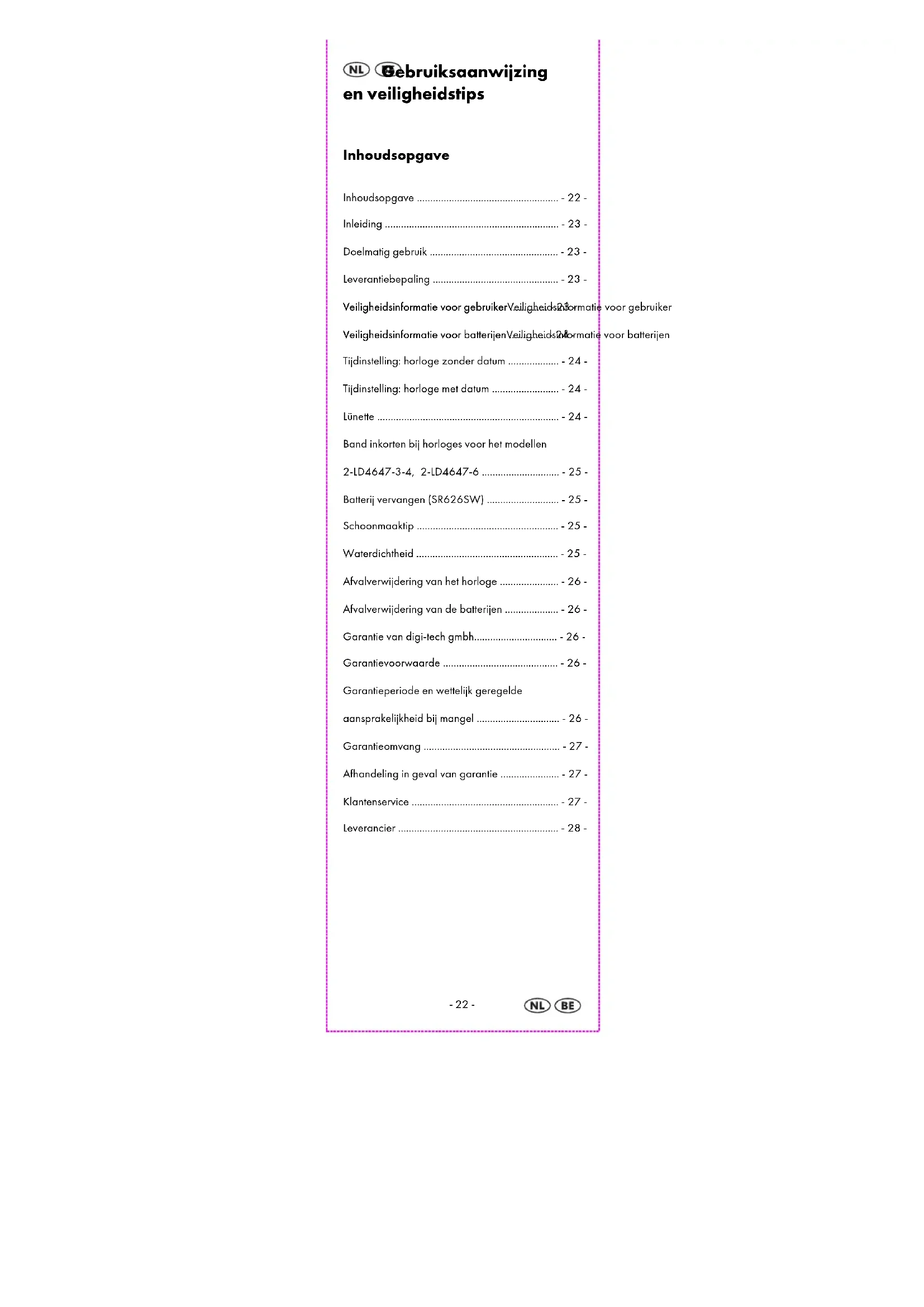 Inhoudsopgave ..................................................... - 22 - Inleiding ................................................................. - 23 - Doelmatig gebruik ................................................ - 23 - Leverantiebepaling ............................................... - 23 - Veiligheidsinformatie voor gebruiker Veiligheidsinformatie voor gebruikerVeiligheidsinformatie voor gebruiker Veiligheidsinformatie voor gebruiker .............. - 23 - Veiligheidsinformatie voor batterijen Veiligheidsinformatie voor batterijenVeiligheidsinformatie voor batterijen Veiligheidsinformatie voor batterijen .............. - 24 - Tijdinstelling: horloge zonder datum ................... - 24 - Tijdinstelling: horloge met datum ......................... - 24 - Lünette .................................................................... - 24 - Band inkorten bij horloges voor het modellen 2-LD4647-3-4, 2-LD4647-6 ............................. - 25 - Batterij vervangen (SR626SW) ........................... - 25 - Schoonmaaktip ..................................................... - 25 - Waterdichtheid ..................................................... - 25 - Afvalverwijdering van het horloge ...................... - 26 - Afvalverwijdering van de batterijen .................... - 26 - Garantie van digi-tech gmbh............................... - 26 - Garantievoorwaarde ........................................... - 26 - Garantieperiode en wettelijk geregelde aansprakelijkheid bij mangel ............................... - 26 - Garantieomvang ................................................... - 27 - Afhandeling in geval van garantie ...................... - 27 - Klantenservice ....................................................... - 27 - Leverancier ............................................................ - 28 --