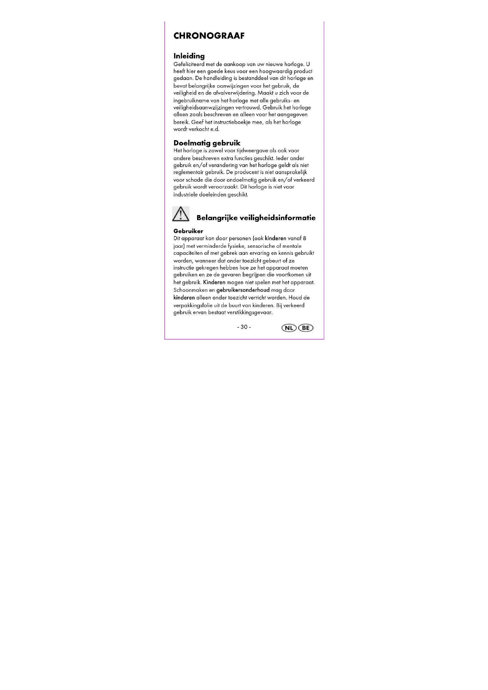 Gefeliciteerd met de aankoop van uw nieuwe horloge. U heeft hier een goede keus voor een hoogwaardig product gedaan. De handleiding is bestanddeel van dit horloge en bevat belangrijke aanwijzingen voor het gebruik, de veilgheid en de afvalverwijdering. Maakt u zich voor de ingebruikname van het horloge met alle gebruiks- en veilgheidsaanwzijzingen vertrouwd. Gebruik het horloge allen zoals beschren en alleen voor het aangegeven bereik. Geef het instructieboekje mee, als het horloge wordt verkocht e.d.