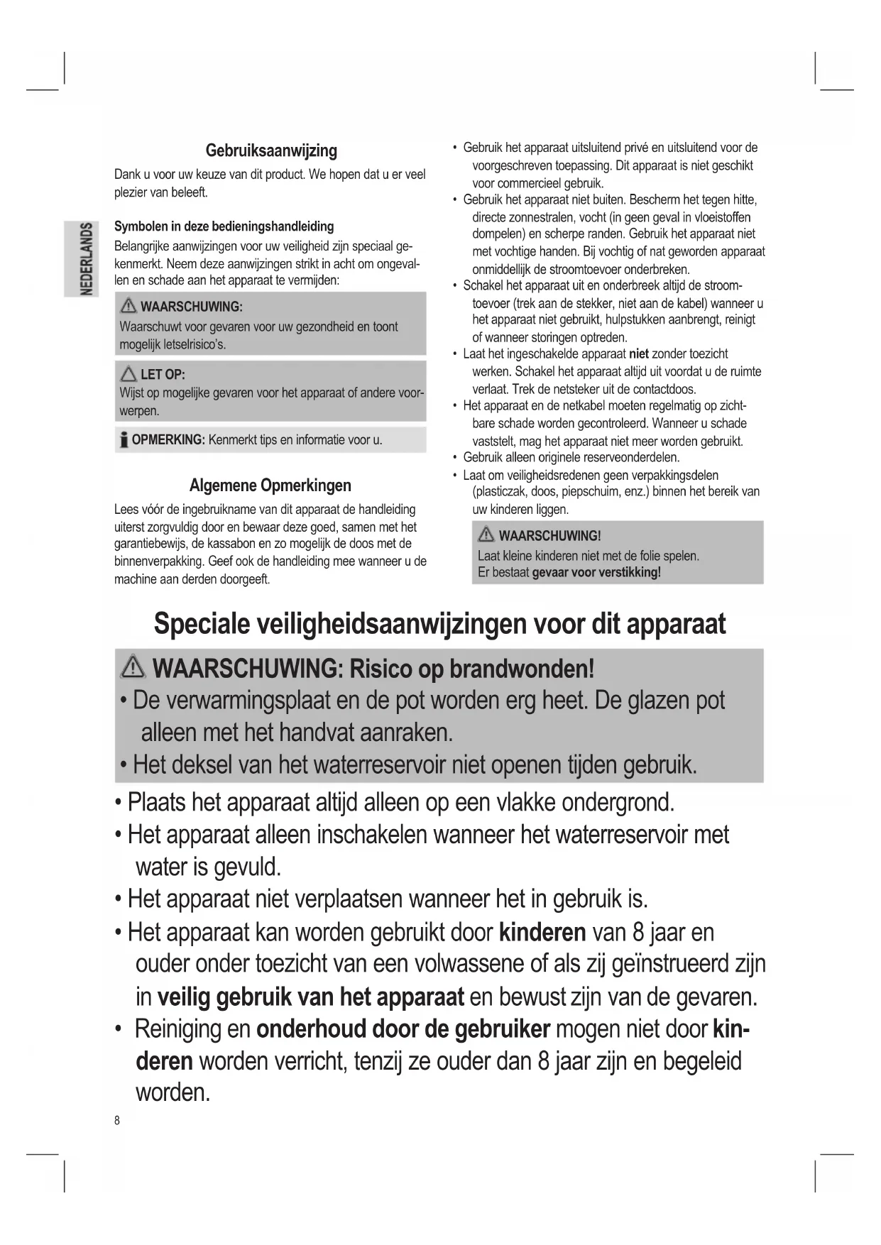 - Het apparaat kan worden gebruikt door kinderen van 8 jaar en ouder onder toezicht van een volwassene of als zij geïnstrueerd zijn in veilig gebruik van het apparaat en bewust zijn van de gevaren.