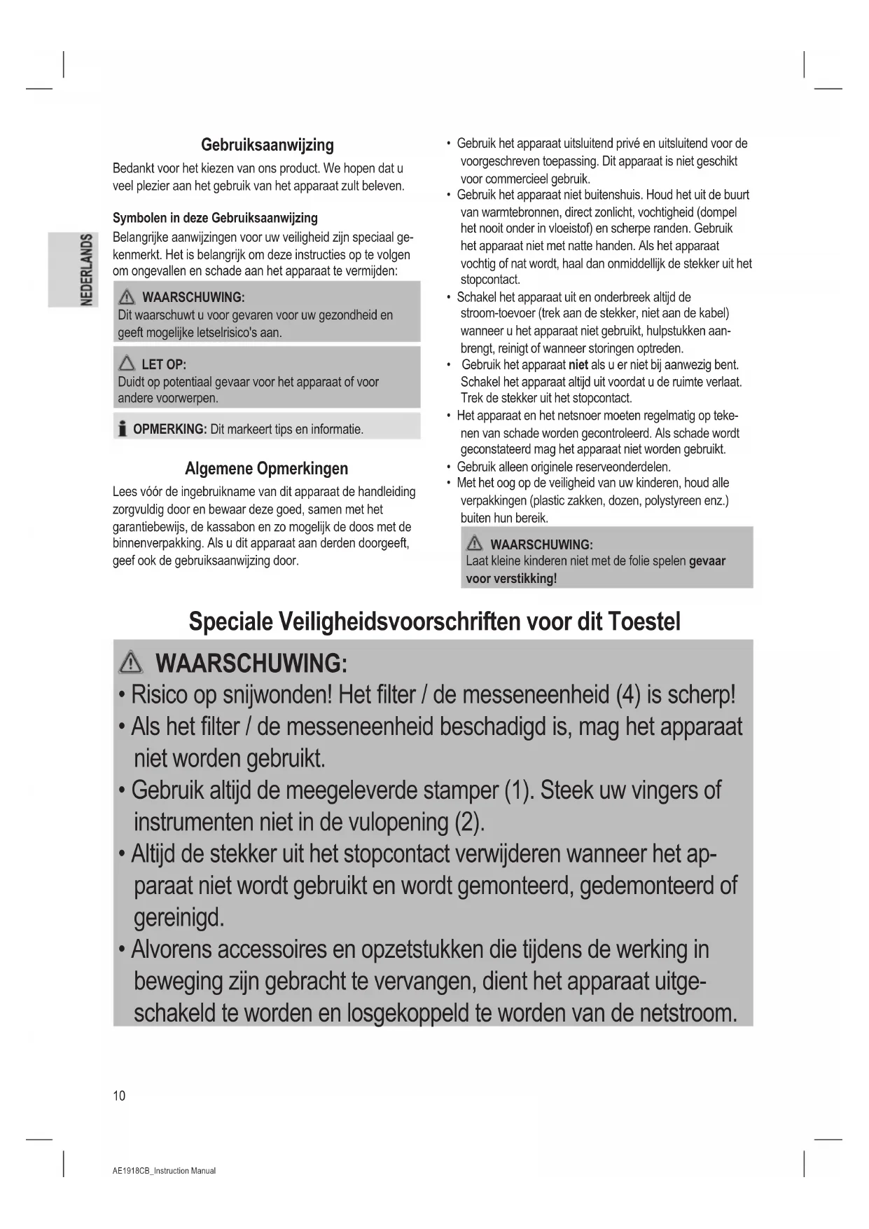 - Met het oog op de veiligheid van uw kinderen, houd alle verpakkingen (plastic zakken, dozen, polystyreen enz.) buiten hun bereik. WAARSCHUWING: Laat kleine kinderen niet met de folie spelen gevaar voor verstikking! Speciale Veiligheidsvoorschriften voor dit Toestel WAARSCHUWING: