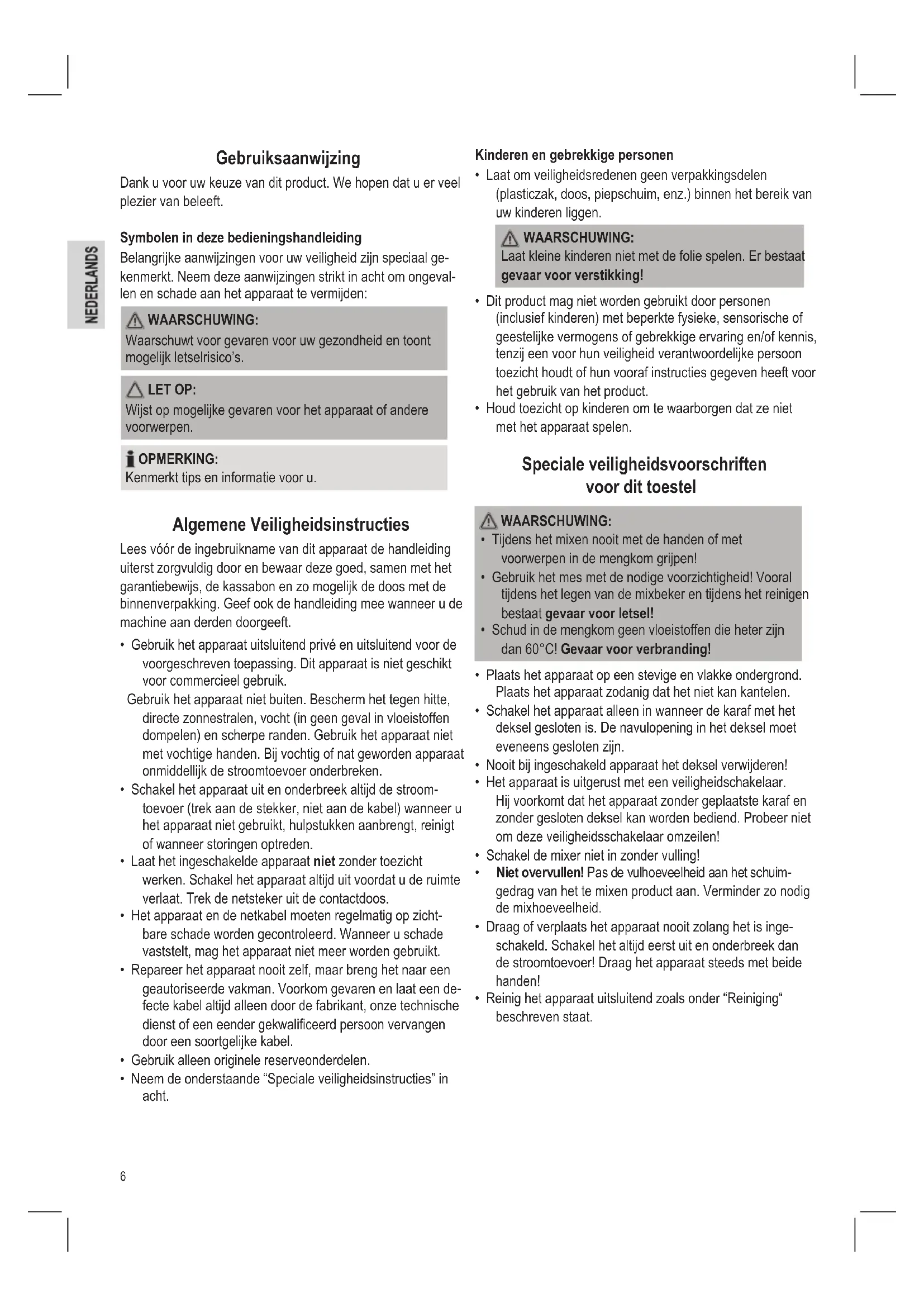 - Neem de onderstaande “Speciale veiligheidsinstructies” in acht. Kinderen en gebrekkige personen