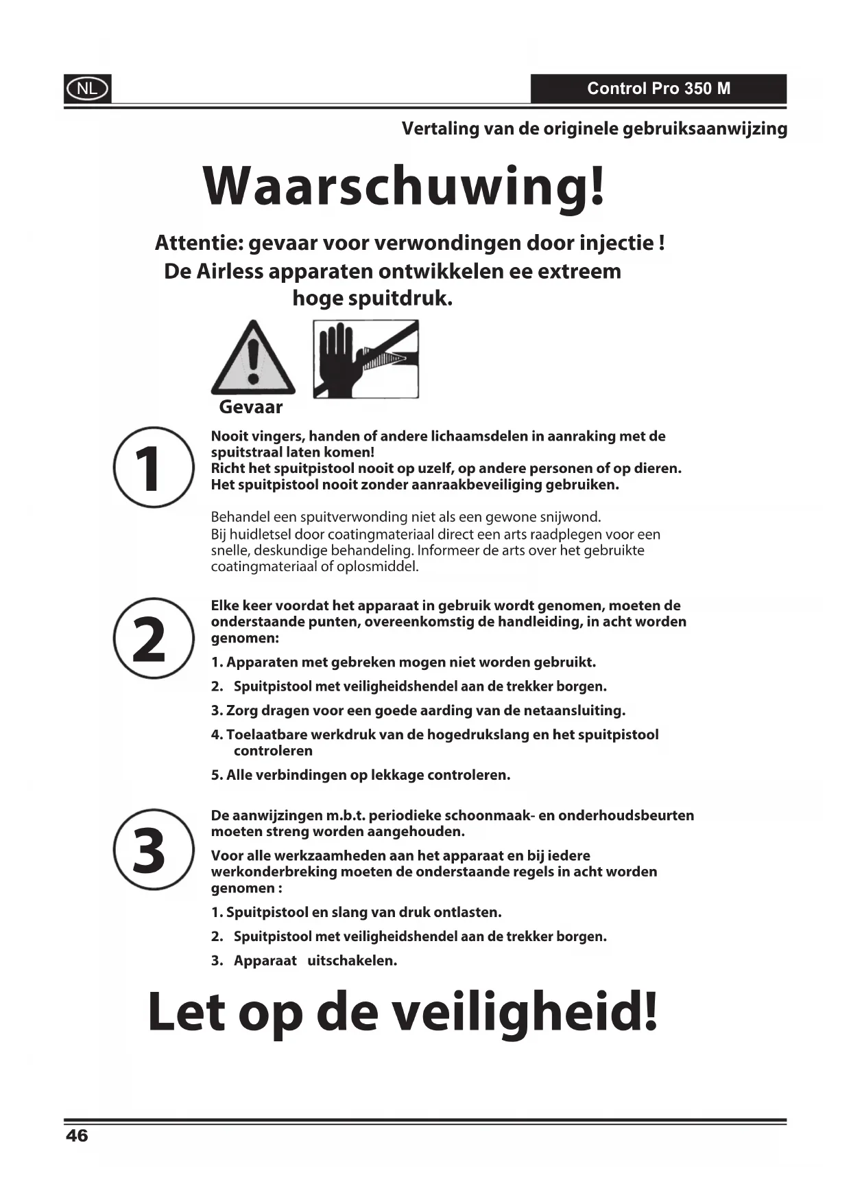 Richt het spuitpistool nooit op uzelf, op andere Personen of op dieren. Het spuitpistool nooit zonder aanraakbeveiliging gebruiken.