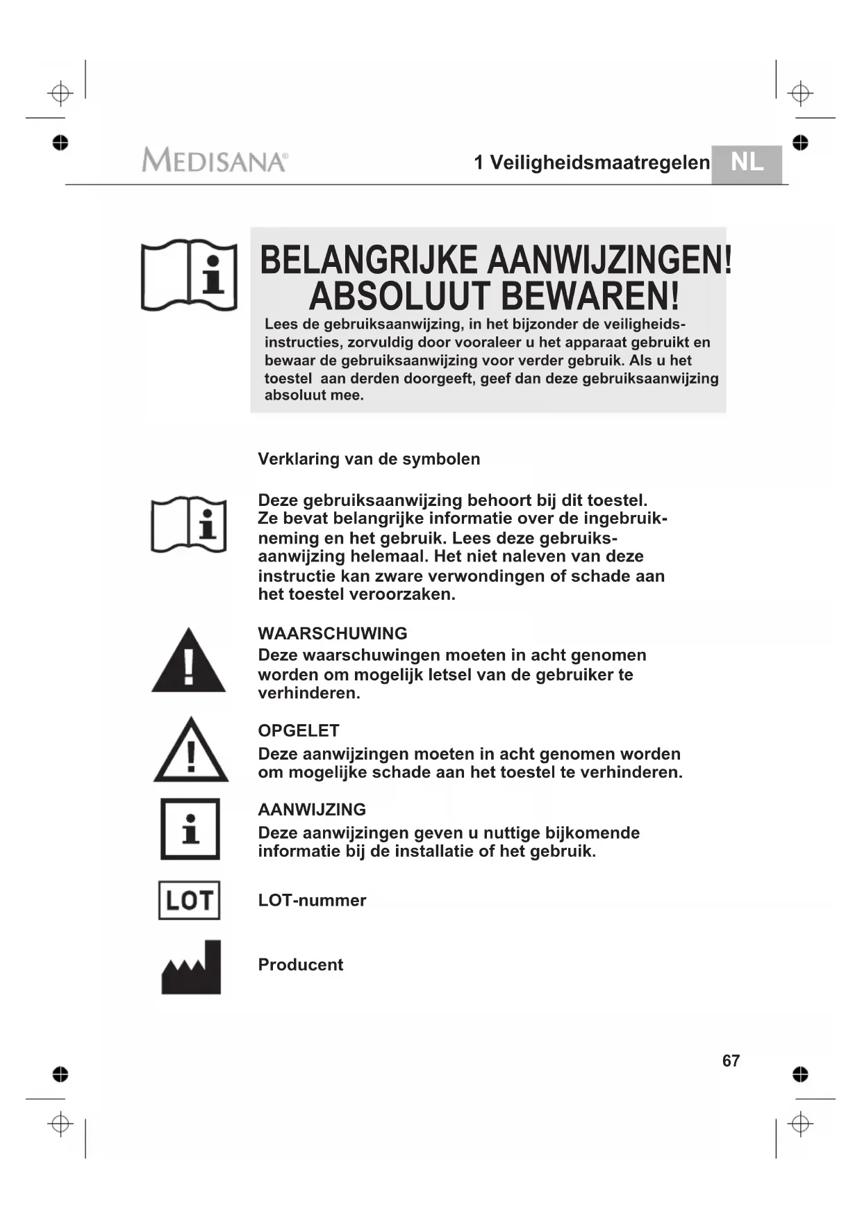 1 Veiligheidsmaatregelen BELANGRIJKE AANWIJZINGEN! ABSOLUUT BEWAREN! Deze gebruiksaanwijzing behoort bij dit toestel. Ze bevat belangrijke informatie over de ingebruik- neming en het gebruik. Lees deze gebruiks- aanwijzing helemaal. Het niet naleven van deze instructie kan zware verwondingen of schade aan het toestel veroorzaken. WAARSCHUWING Deze waarschuwingen moeten in acht genomen worden om mogelijk letsel van de gebruiker te verhinderen. OPGELET Deze aanwijzingen moeten in acht genomen worden om mogelijke schade aan het toestel te verhinderen. AANWIJZING Deze aanwijzingen geven u nuttige bijkomende informatie bij de installatie of het gebruik. Producent Lees de gebruiksaanwijzing, in het bijzonder de veiligheids-instructies, zorvuldig door vooraleer u het apparaat gebruikt en bewaar de gebruiksaanwijzing voor verder gebruik. Als u het toestel aan derden doorgeeft, geef dan deze gebruiksaanwijzing Verklaring van de symbolen absoluut mee. LOT-nummerNL 1 Veiligheidsmaatregelen