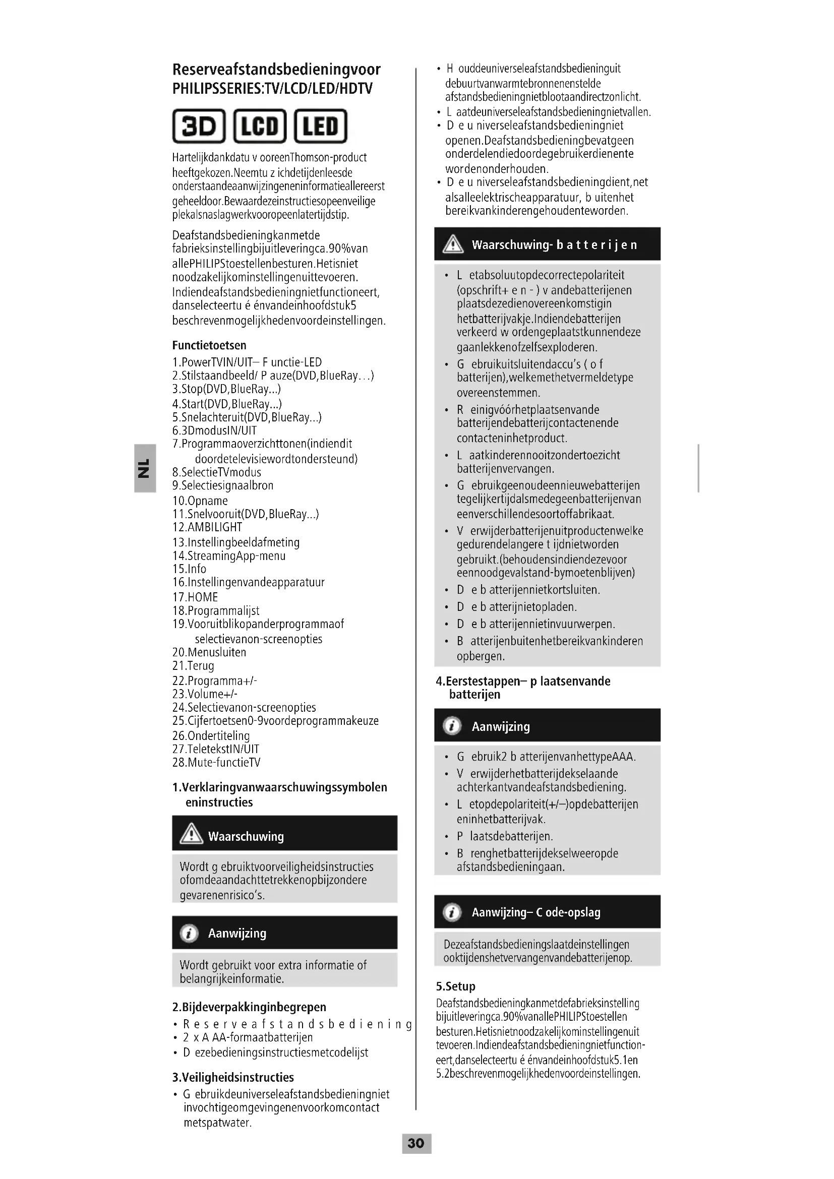 Hartelijk dank dat uvoor een Thomson-product heeft gekozen. Neemt uzich de tijd en lees de onderstaande aanwijzingen en informatie allereerst geheel door. Bewaar deze instructies op een veilige plek als naslagwerk voor op een later tijdstip. De afstandsbediening kan met de fabrieksinstelling bij uitlevering ca. 90% van alle PHILIPS toestellen besturen. Het is niet noodzakelijk om instellingen uit te voeren. Indien de afstandsbediening niet functioneert, dan selecteert uéén van de in hoofdstuk 5 beschreven mogelijkheden voor de instellingen. Functietoetsen