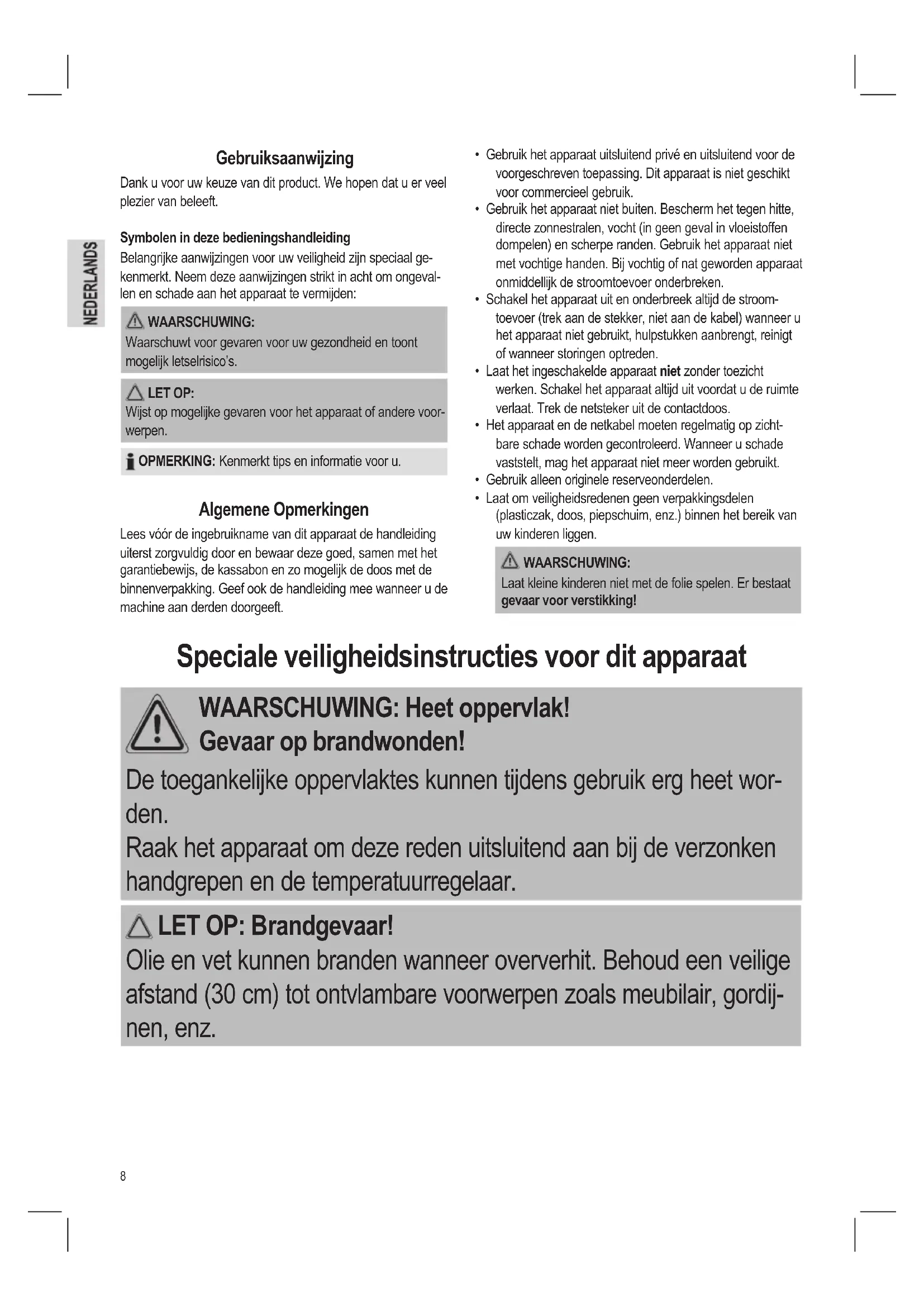 - Laat om veiligheidsredenen geen verpakkingsdelen (plasticzak, doos, piepschuim, enz.) binnen het bereik van uw kinderen liggen. WAARSCHUWING: Laat kleine kinderen niet met de folie spelen. Er bestaat gevaar voor verstikking! Gebruiksaanwijzing Dank u voor uw keuze van dit product. We hopen dat u er veel plezier van beleeft. Symbolen in deze bedieningshandleiding Belangrijke aanwijzingen voor uw veiligheid zijn speciaal ge- kenmerkt. Neem deze aanwijzingen strikt in acht om ongeval- len en schade aan het apparaat te vermijden: WAARSCHUWING: Waarschuwt voor gevaren voor uw gezondheid en toont mogelijk letselrisico’s. LET OP: Wijst op mogelijke gevaren voor het apparaat of andere voor- werpen. OPMERKING: Kenmerkt tips en informatie voor u. Algemene Opmerkingen Lees vóór de ingebruikname van dit apparaat de handleiding uiterst zorgvuldig door en bewaar deze goed, samen met het garantiebewijs, de kassabon en zo mogelijk de doos met de binnenverpakking. Geef ook de handleiding mee wanneer u de machine aan derden doorgeeft. Speciale veiligheidsinstructies voor dit apparaat WAARSCHUWING: Heet oppervlak! Gevaar op brandwonden! De toegankelijke oppervlaktes kunnen tijdens gebruik erg heet wor- den. Raak het apparaat om deze reden uitsluitend aan bij de verzonken handgrepen en de temperatuurregelaar. LET OP: Brandgevaar! Olie en vet kunnen branden wanneer oververhit. Behoud een veilige afstand (30 cm) tot ontvlambare voorwerpen zoals meubilair, gordij- nen, enz.9 LET OP: Dit apparaat mag niet worden ondergedompeld in water tijdens het reinigen. Raadpleeg de instructies die zijn voorzien in het hoofdstuk “Reiniging”