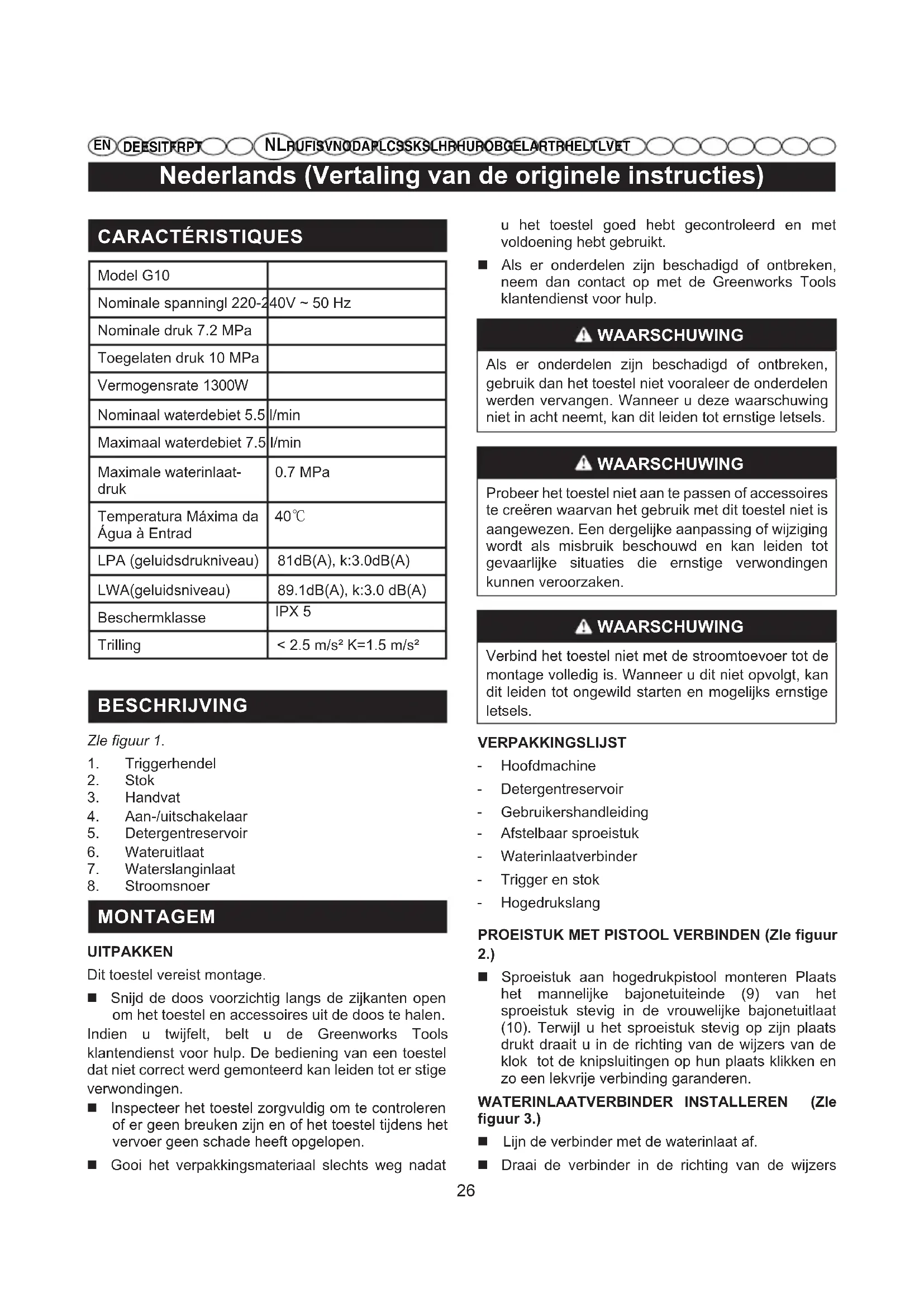 MONTAGEM UITPAKKEN Dit toestel vereist montage. Snijd de doos voorzichtig langs de zijkanten open om het toestel en accessoires uit de doos te halen. Indien u twijfelt, belt u de Greenworks Tools klantendienst voor hulp. De bediening van een toestel dat niet correct werd gemonteerd kan leiden tot er stige verwondingen. Inspecteer het toestel zorgvuldig om te controleren of er geen breuken zijn en of het toestel tijdens het vervoer geen schade heeft opgelopen. Gooi het verpakkingsmateriaal slechts weg nadat u het toestel goed hebt gecontroleerd en met voldoening hebt gebruikt. Als er onderdelen zijn beschadigd of ontbreken, neem dan contact op met de Greenworks Tools klantendienst voor hulp. WAARSCHUWING Als er onderdelen zijn beschadigd of ontbreken, gebruik dan het toestel niet vooraleer de onderdelen werden vervangen. Wanneer u deze waarschuwing niet in acht neemt, kan dit leiden tot ernstige letsels. WAARSCHUWING Probeer het toestel niet aan te passen of accessoires te creëren waarvan het gebruik met dit toestel niet is aangewezen. Een dergelijke aanpassing of wijziging wordt als misbruik beschouwd en kan leiden tot gevaarlijke situaties die ernstige verwondingen kunnen veroorzaken. WAARSCHUWING Verbind het toestel niet met de stroomtoevoer tot de montage volledig is. Wanneer u dit niet opvolgt, kan dit leiden tot ongewild starten en mogelijks ernstige letsels. VERPAKKINGSLIJST - Hoofdmachine - Detergentreservoir - Gebruikershandleiding - Afstelbaar sproeistuk - Waterinlaatverbinder - Trigger en stok - Hogedrukslang PROEISTUK MET PISTOOL VERBINDEN (Zle figuur 2.) Sproeistuk aan hogedrukpistool monteren Plaats het mannelijke bajonetuiteinde (9) van het sproeistuk stevig in de vrouwelijke bajonetuitlaat (10). Terwijl u het sproeistuk stevig op zijn plaats drukt draait u in de richting van de wijzers van de klok tot de knipsluitingen op hun plaats klikken en zo een lekvrije verbinding garanderen. WATERINLAATVERBINDER INSTALLEREN (Zle figuur 3.) Lijn de verbinder met de waterinlaat af. Draai de verbinder in de richting van de wijzersNederlands (Vertaling van de originele instructies)