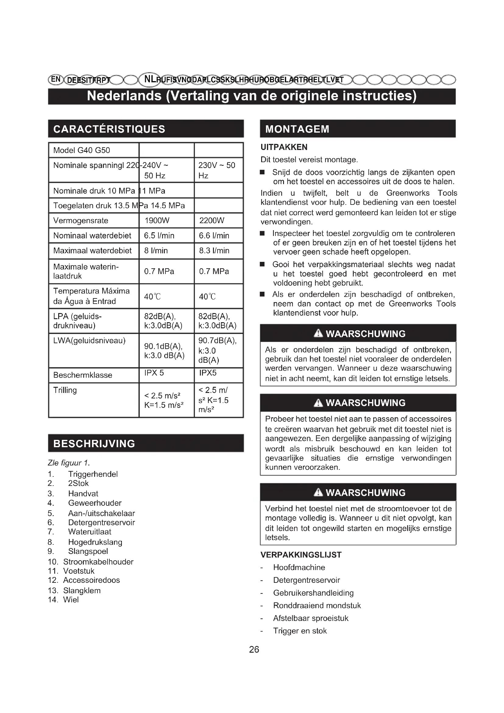 MONTAGEM UITPAKKEN Dit toestel vereist montage. Snijd de doos voorzichtig langs de zijkanten open om het toestel en accessoires uit de doos te halen. Indien u twijfelt, belt u de Greenworks Tools klantendienst voor hulp. De bediening van een toestel dat niet correct werd gemonteerd kan leiden tot er stige verwondingen. Inspecteer het toestel zorgvuldig om te controleren of er geen breuken zijn en of het toestel tijdens het vervoer geen schade heeft opgelopen. Gooi het verpakkingsmateriaal slechts weg nadat u het toestel goed hebt gecontroleerd en met voldoening hebt gebruikt. Als er onderdelen zijn beschadigd of ontbreken, neem dan contact op met de Greenworks Tools klantendienst voor hulp. WAARSCHUWING Als er onderdelen zijn beschadigd of ontbreken, gebruik dan het toestel niet vooraleer de onderdelen werden vervangen. Wanneer u deze waarschuwing niet in acht neemt, kan dit leiden tot ernstige letsels. WAARSCHUWING Probeer het toestel niet aan te passen of accessoires te creëren waarvan het gebruik met dit toestel niet is aangewezen. Een dergelijke aanpassing of wijziging wordt als misbruik beschouwd en kan leiden tot gevaarlijke situaties die ernstige verwondingen kunnen veroorzaken. WAARSCHUWING Verbind het toestel niet met de stroomtoevoer tot de montage volledig is. Wanneer u dit niet opvolgt, kan dit leiden tot ongewild starten en mogelijks ernstige letsels. VERPAKKINGSLIJST - Hoofdmachine - Detergentreservoir - Gebruikershandleiding - Ronddraaiend mondstuk - Afstelbaar sproeistuk - Trigger en stokNederlands (Vertaling van de originele instructies)