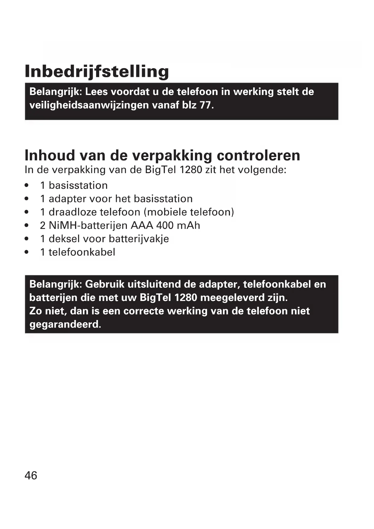 Belangrijk: Gebruik uitsluitend de adapter, telefoonkabel en batterijen die met uw BigTel 1280 meegeleverd zich. Zo Niet, dan is een correcte werkinq van de telefooN nicht gegarandeerd.