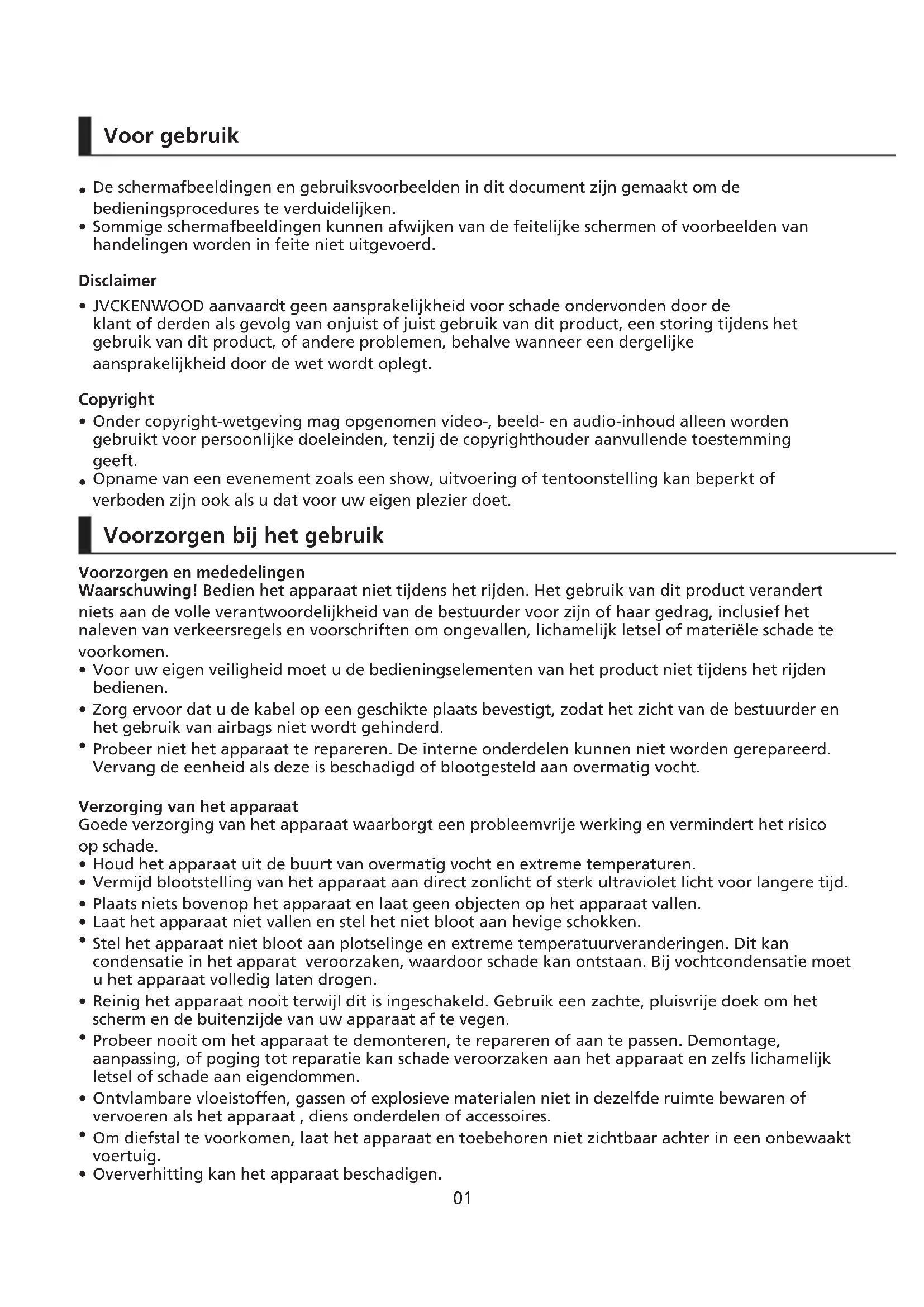 Voor gebruik De schermafbeeldingen en gebruiksvoorbeelden in dit document zijn gemaakt om de bedieningsprocedures te verduidelijken. Sommige schermafbeeldingen kunnen afwijken van de feitelijke schermen of voorbeelden van handelingen worden in feite niet uitgevoerd. JVCKENWOOD aanvaardt geen aansprakelijkheid voor schade ondervonden door de klant of derden als gevolg van onjuist of juist gebruik van dit product, een storing tijdens het gebruik van dit product, of andere problemen, behalve wanneer een dergelijke aansprakelijkheid door de wet wordt oplegt. Onder copyright-wetgeving mag opgenomen video-, beeld- en audio-inhoud alleen worden gebruikt voor persoonlijke doeleinden, tenzij de copyrighthouder aanvullende toestemming geeft. Opname van een evenement zoals een show, uitvoering of tentoonstelling kan beperkt of verboden zijn ook als u dat voor uw eigen plezier doet.