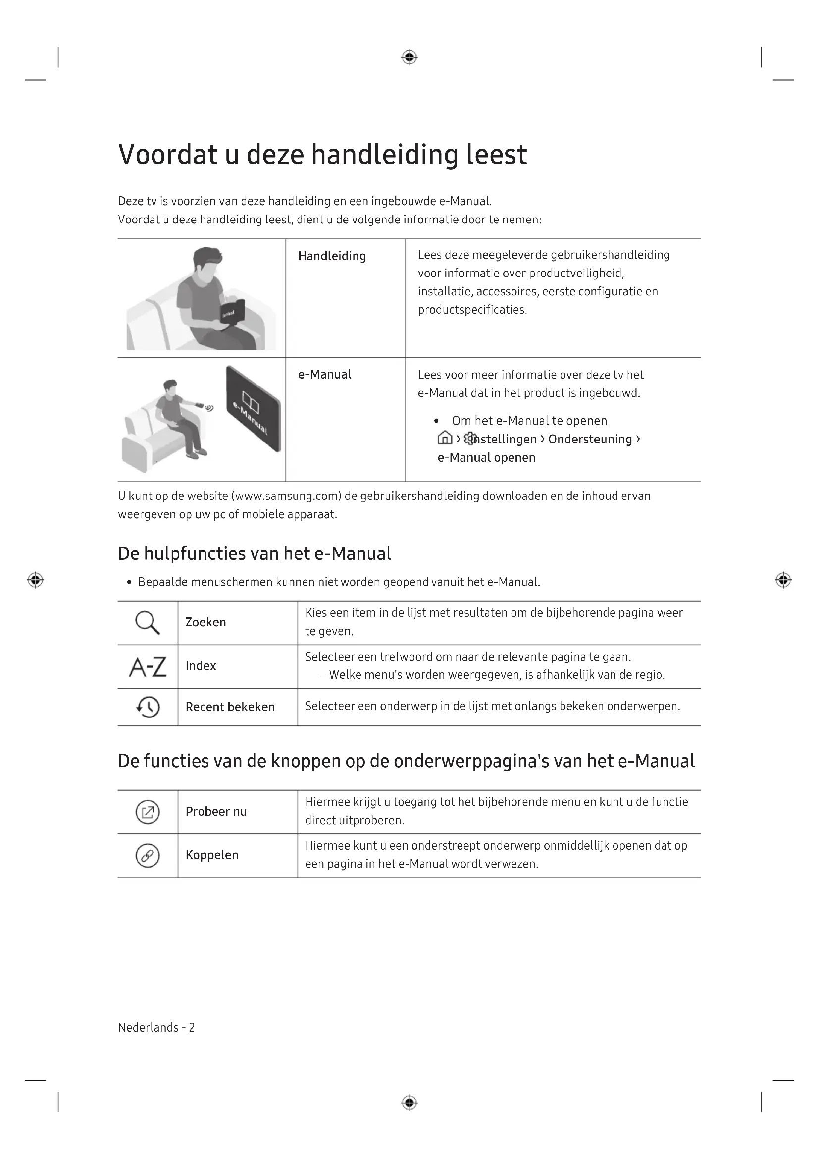 - Om het e-Manual te openen > Instellingen > Ondersteuning > e-Manual openen U kunt op de website (www.samsung.com) de gebruikershandleiding downloaden en de inhoud ervan weergeven op uw pc of mobiele apparaat. De hulpfuncties van het e-Manual