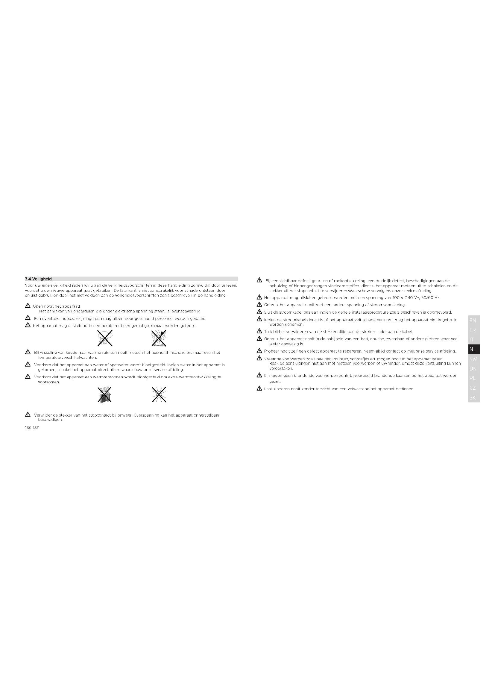 Voor uw eigen veiligheid raden wij u aan de veiligheidsvoorschriften in deze handleiding zorgvuldig door te lezen, voordat u uw nieuwe apparaat gaat gebruiken. De fabrikant is niet aansprakelijk voor schade ontstaan door onjuist gebruik en door het niet voldoen aan de veiligheidsvoorschriften zoals beschreven in de handleiding. Open nooit het apparaat! Het aanraken van onderdelen die onder elektrische spanning staan, is levensgevaarlijk! Een eventueel noodzakelijk ingrijpen mag alleen door geschoold personeel worden gedaan. Het apparaat mag uitsluitend in een ruimte met een gematigd klimaat worden gebruikt. Bij wisseling van koude naar warme ruimten nooit meteen het apparaat inschakelen, maar even het temperatuurverschil afwachten. Voorkom dat het apparaat aan water of spatwater wordt blootgesteld. Indien water in het apparaat is gekomen, schakel het apparaat direct uit en waarschuw onze service afdeling. Voorkom dat het apparaat aan warmtebronnen wordt blootgesteld om extra warmteontwikkeling te voorkomen. Verwijder de stekker van het stopcontact bij onweer. Overspanning kan het apparaat onherstelbaar beschadigen. BDA_DIGITRADIO_600_630.indd 186-187 22/06/2018 09:32188 189