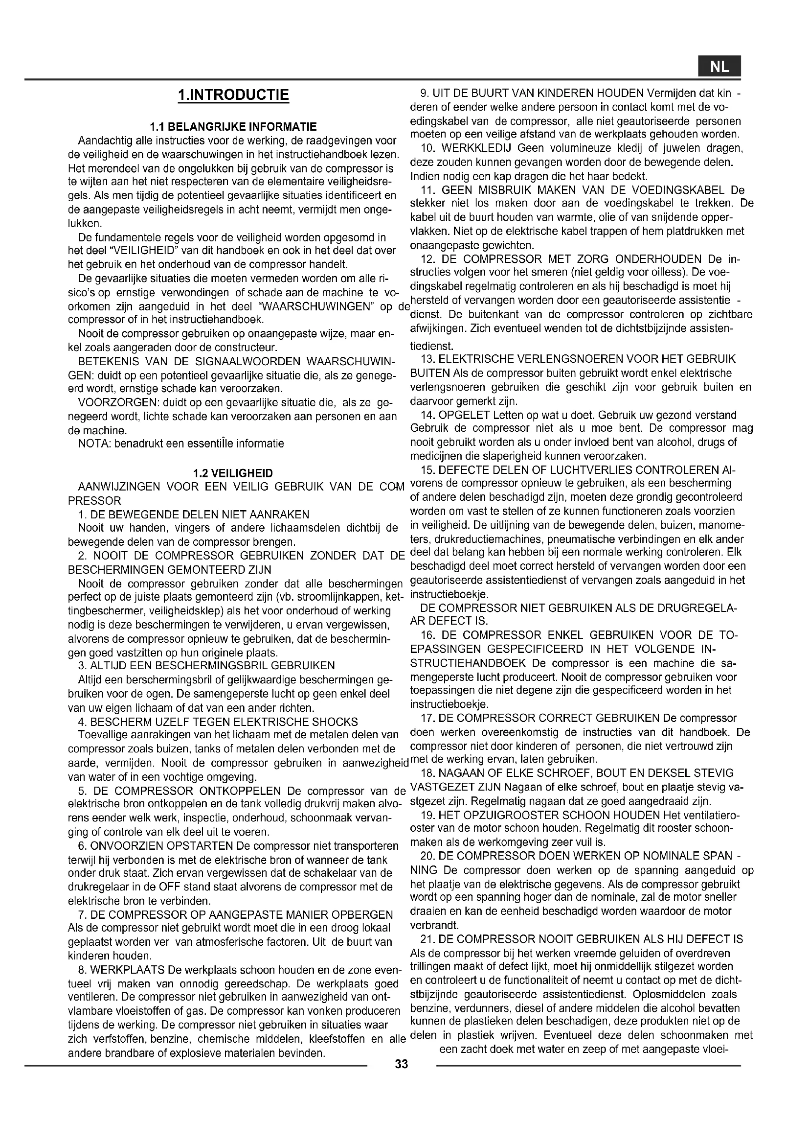 Aandachtig alle instructies voor de werking, de raadgevingen voor de veiligheid en de waarschuwingen in het instructiehandboek lezen. Het merendeel van de ongelukken bij gebruik van de compressor is te wijten aan het niet respecteren van de elementaire veiligheidsre-
