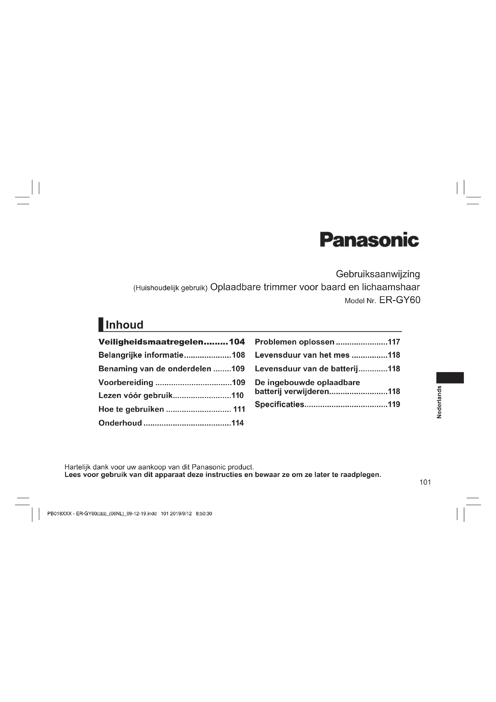 vervangen door een erkend service center. Probleem Actie Het apparaat is bot geworden. De werktijd is kort. Het apparaat functioneert niet meer. Laad de batterij ongeveer 8 uur op zonder onderbreking om deze te regenereren. Als er na het opladen weinig gebruiksbeurten overblijven, heeft de batterij het einde van de levensduur bereikt. (Op het einde van de levensduur van de batterij kan er vloeistof lekken door de ontaarding.) Neem voor reparatie contact op met een erkend servicebedrijf. Het apparaat kan niet worden opgeladen. Steek de stekker stevig in het apparaat. Controleer of oplaadstatuslampje brandt. (Zie pagina 109.) Maakt veel lawaai. Olie aanbrengen. (Zie pagina 116.) Controleer of het mes goed is bevestigd. PB018XXX - ER-GY60_(06NL)_09-12-19.indd 117 2019/9/12 8:50:43118 Nederlands Levensduur van het mes De levensduur van het mes varieert afhankelijk van de frequentie en de duur van het gebruik van het apparaat. De levensduur van het mes is bijvoorbeeld ongeveer 3 jaar wanneer het apparaat 10 maal per maand 5 minuten wordt gebruikt. Vervang de messen als het knipvermogen ondanks juist onderhoud aanzienlijk afneemt. Levensduur van de batterij De levensduur van de batterij varieert afhankelijk van hoe vaak en hoe lang deze per keer wordt gebruikt. Als de batterij eenmaal per maand wordt opgeladen, zal deze ongeveer 3 jaar meegaan. Als de gebruiksduur aanzienlijk korter is, zelfs wanneer de batterij volledig is opgeladen, heeft de batterij het einde van zijn levensduur bereikt. De ingebouwde oplaadbare batterij verwijderen De ingebouwde oplaadbare batterij uit het apparaat verwijderen voordat u het apparaat weggooit. De batterij moet op een veilige manier worden weggegooid. Lever de batterij in op een speciaal daarvoor bestemd verzamelpunt bij u in de buurt. Deze afbeelding dient alleen gebruikt te worden voor het inleveren van het apparaat en mag niet worden gebruikt om hem te repareren. Als u het apparaat zelf demonteert, is deze niet meer waterdicht, wat storingen kan veroorzaken.