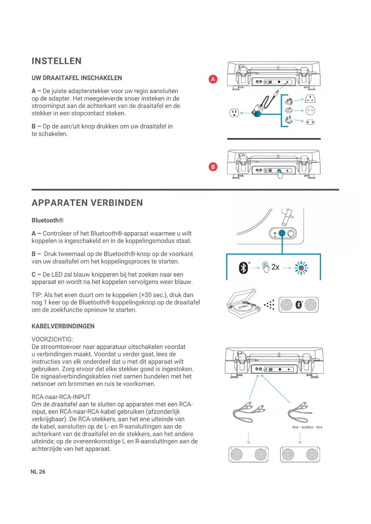 APPARATEN VERBINDEN Bluetooth® A – Controleer of het Bluetooth®-apparaat waarmee u wilt koppelen is ingeschakeld en in de koppelingsmodus staat. B – Druk tweemaal op de Bluetooth®-knop op de voorkant van uw draaitafel om het koppelingsproces te starten. C – De LED zal blauw knipperen bij het zoeken naar een apparaat en wordt na het koppelen vervolgens weer blauw. TIP: Als het even duurt om te koppelen (+30 sec.), druk dan nog 1 keer op de Bluetooth®-koppelingsknop op de draaitafel om de zoekfunctie opnieuw te starten. KABELVERBINDINGEN VOORZICHTIG: De stroomtoevoer naar apparatuur uitschakelen voordat u verbindingen maakt. Voordat u verder gaat, lees de instructies van elk onderdeel dat u met dit apparaat wilt gebruiken. Zorg ervoor dat elke stekker goed is ingestoken. De signaalverbindingskables niet samen bundelen met het netsnoer om brommen en ruis te voorkomen. RCA-naar-RCA-INPUT Om de draaitafel aan te sluiten op apparaten met een RCA- input, een RCA-naar-RCA-kabel gebruiken (afzonderlijk verkrijgbaar). De RCA-stekkers, aan het ene uiteinde van de kabel, aansluiten op de L- en R-aansluitingen aan de achterkant van de draaitafel en de stekkers, aan het andere uiteinde, op de overeenkomstige L en R-aansluitingen aan de achterzijde van het apparaat.