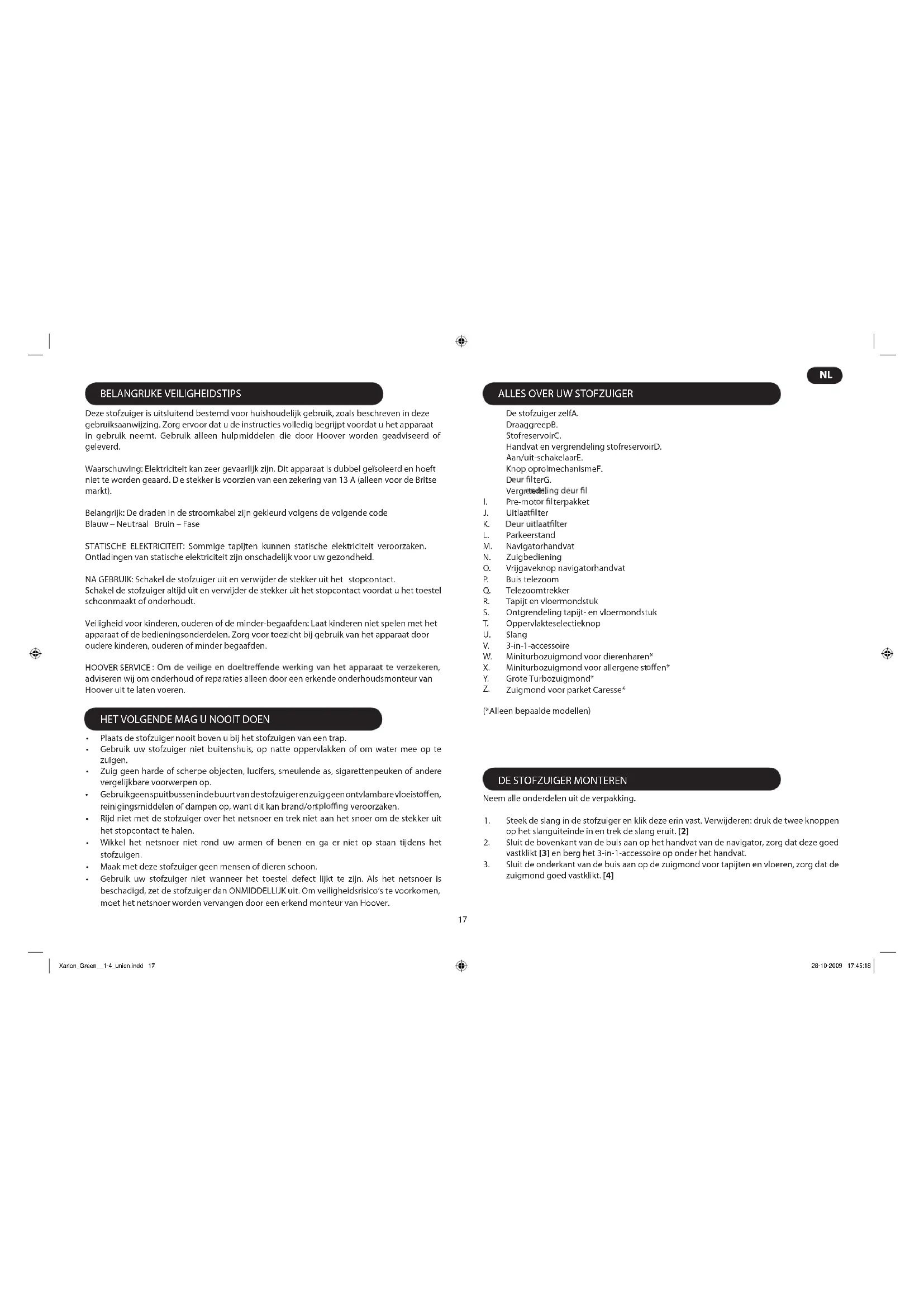 (*Alleen bepaalde modellen) Neem alle onderdelen uit de verpakking. Steek de slang in de stofzuiger en klik deze erin vast. Verwijderen: druk de twee knoppen 1. op het slanguiteinde in en trek de slang eruit. [2] Sluit de bovenkant van de buis aan op het handvat van de navigator, zorg dat deze goed 2. vastklikt [3] en berg het 3-in-1-accessoire op onder het handvat. Sluit de onderkant van de buis aan op de zuigmond voor tapijten en vloeren, zorg dat de 3. zuigmond goed vastklikt. [4] Plaats de stofzuiger nooit boven u bij het stofzuigen van een trap.• Gebruik uw stofzuiger niet buitenshuis, op natte oppervlakken of om water mee op te • zuigen. Zuig geen harde of scherpe objecten, lucifers, smeulende as, sigarettenpeuken of andere • vergelijkbare voorwerpen op. Gebruik geen spuitbussen in de buurt van de stofzuiger en zuig geen ontvlambare vloeist en, • reinigingsmiddelen of dampen op, want dit kan brand/on veroorzaken. Rijd niet met de stofzuiger over het netsnoer en trek niet aan het snoer om de stekker uit • het stopcontact te halen. Wikkel het netsnoer niet rond uw armen of benen en ga er niet op staan tijdens het • stofzuigen. Maak met deze stofzuiger geen mensen of dieren schoon.• Gebruik uw stofzuiger niet wanneer het toestel defect lijkt te zijn. Als het netsnoer is • beschadigd, zet de stofzuiger dan ONMIDDELLIJK uit. Om veiligheidsrisico’s te voorkomen, moet het netsnoer worden vervangen door een erkend monteur van Hoover. Xarion_Green__1-4_union.indd 17 28-10-2009 17:45:18 Z.18