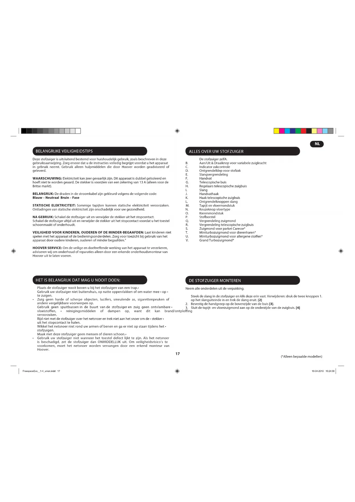 (*Alleen bepaalde modellen) ACCESSOIRES Zie de specicaties van het model op het verpakkingsetiket voor de accessoires van de afzonderlijke modellen. Alle accessoires kunnen op de handgreep van de slang of op het uiteinde van de telescopische buis worden geplaatst. Kierenmondstuk – Voor hoeken en moeilijk bereikbare plaatsen. Neem het kierenmondstuk uit de accessoirehouder [24] en breng het op de slanghandgreep [25] of de telescopische buis aan. Stofborstel – Voor boekenrekken, kozijnen, toetsenborden en andere kwetsbare plekken. Neem het kierenmondstuk uit de accessoirehouder [24] en breng het op de slanghandgreep [25] of de telescopische buis aan. Zuigmond voor parket Caresse* – Voor parketvloeren en andere kwetsbare vloeren.[1S] Miniturbozuigmond voor dierenharen* - Gebruik het miniturbomondstuk voor trappen of voor het grondig reinigen van textielproducten en andere moeilijk schoon te maken plekken. Vooral geschikt voor het verwijderen van haren van huisdieren. [1T] Miniturbozuigmond voor allergene stoen* – Gebruik het miniturbomondstuk voor trappen of voor het grondig reinigen van textielproducten en andere moeilijk schoon te maken plekken. Vooral geschikt voor het verwijderen van allergene stoen. [1U] Grand Turbozuigmond* – Gebruik het Grand Turbo-mondstuk voor het diep reinigen van tapijten. [1V] BELANGRIJK: Gebruik het Grand Turbo-mondstuk of het Mini Turbo-mondstuk niet op tapijten met lange franjes, op dierenhuiden of op tapijten dikker dan 15 mm. Houd het mondstuk niet stil wanneer de borstel draait. CHECKLIST GEBRUIKER Mocht u problemen ondervinden met dit product, loop dan deze eenvoudige checklist na voordat u uw Hoover dealer belt. Krijgt de stofzuiger wel stroom? Controleer dit met een ander elektrisch toestel.• Is de stofzak vol? Zie ‘Onderhoud stofzuiger’.• Is de filter verstopt? Zie ‘Onderhoud stofzuiger’.• Is de slang of de zuigmond geblokkeerd? Zie ‘Verstoppingen uit het systeem • verwijderen’. Is de stofzuiger oververhit? Zo ja, dan duurt het ongeveer 45 minuten voordat het • toestel weer gereed is voor gebruik. BELANGRIJKE INFORMATIE Originele reserveonderdelen en toebehoren van Hoover Gebruik uitsluitend originele reserveonderdelen van Hoover. Deze zijn verkrijgbaar bij uw Hoover Dealer. Als u onderdelen bestelt, vermeld dan altijd het modelnummer. Verbruiksartikelen Papieren zak: H69 - 35601053• Microvezel zak: H71 - 35601069 (Indien leverbaar)• Uitlaat microfilter: T102 - 35601056• Hepa pre-motor filter: S107 - 35601057• Originele reserveonderdelen Tapijt en vloermondstuk - G72 - 4845090• Stoffen slang: - D118 - 35601054• Flexibele slang - D122 - 35601055• Zuigmond voor parket Caresse: G90PCB - 35600934• Miniturbozuigmond voor allergene stoffen: J32 - 35600817• Grand Turbozuigmond: J31 - 35600816• Hoover Service Mocht u gebruik willen maken van de service, neem dan contact op met uw Hoover dealer. FreespaceEvo__1-4_union.indd 19 16-04-2010 16:24:3020