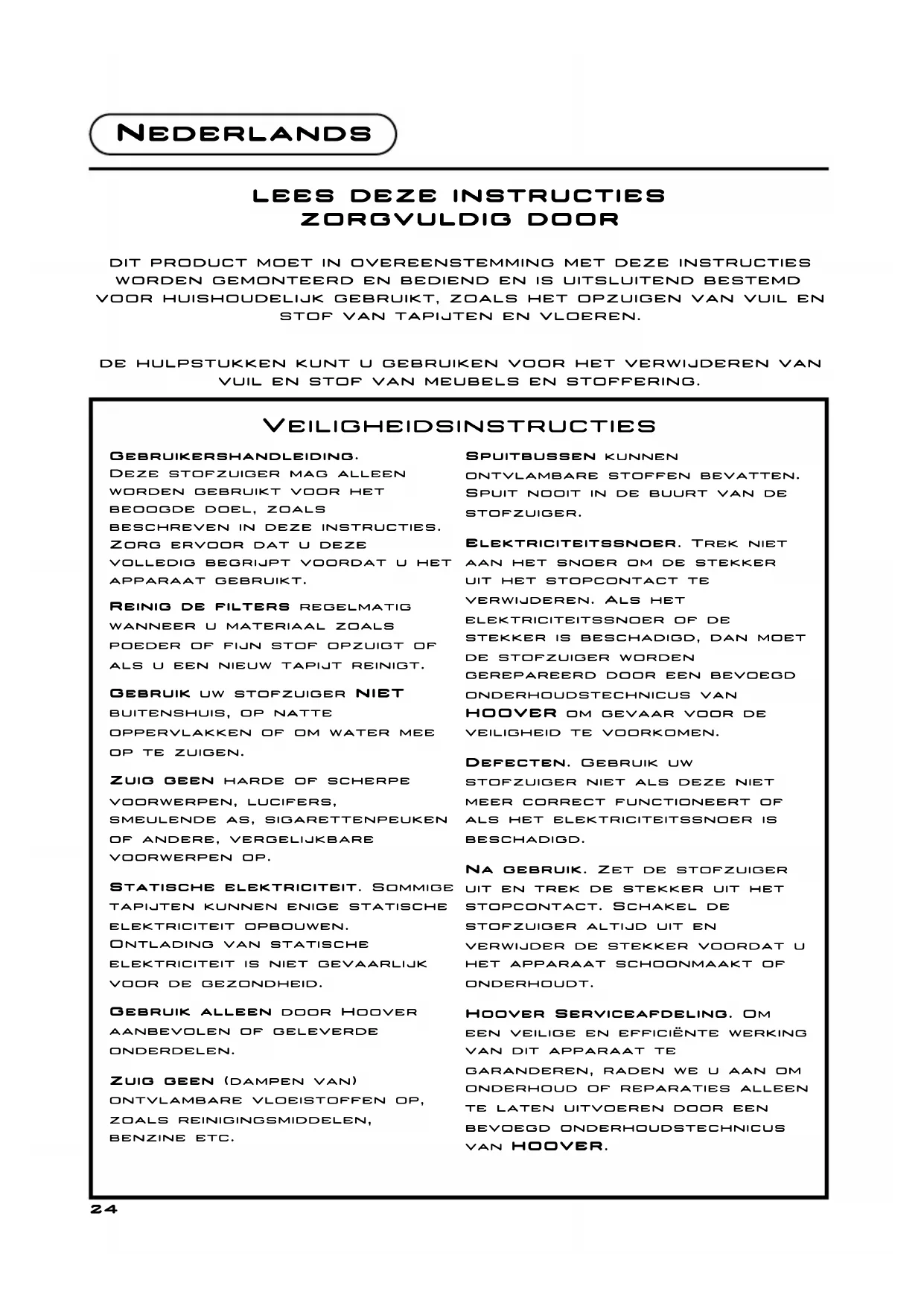 Deze stofzuiger mag alleen worden gebruikt voor het beoogde doel, zoals beschreven in deze instructies. Zorg ervoor dat u deze volledig begrijpt voordat u het apparaat gebruikt. Reinig de filters regelmatig wanneer u materiaal zoals poeder of fijn stof opzuigt of als u een nieuw tapijt reinigt. Gebruik uw stofzuiger NIET buitenshuis, op natte oppervlakken of om water mee op te zuigen. Zuig geen harde of scherpe voorwerpen, lucifers, smeulende as, sigarettenpeuken of andere, vergelijkbare voorwerpen op. Statische elektriciteit. Sommige tapijten kunnen enige statische elektriciteit opbouwen. Ontlading van statische elektriciteit is niet gevaarlijk voor de gezondheid. Gebruik alleen door Hoover aanbevolen of geleverde onderdelen. Zuig geen (dampen van) ontvlambare vloeistoffen op, zoals reinigingsmiddelen, benzine etc. Spuitbussen kunnen ontvlambare stoffen bevatten. Spuit nooit in de buurt van de stofzuiger. Elektriciteitssnoer. Trek niet aan het snoer om de stekker uit het stopcontact te verwijderen. Als het elektriciteitssnoer of de stekker is beschadigd, dan moet de stofzuiger worden gerepareerd door een bevoegd onderhoudstechnicus van HOOVER om gevaar voor de veiligheid te voorkomen. Defecten. Gebruik uw stofzuiger niet als deze niet meer correct functioneert of als het elektriciteitssnoer is beschadigd. Na gebruik. Zet de stofzuiger uit en trek de stekker uit het stopcontact. Schakel de stofzuiger altijd uit en verwijder de stekker voordat u het apparaat schoonmaakt of onderhoudt. Hoover Serviceafdeling. Om een veilige en efficiënte werking van dit apparaat te garanderen, raden we u aan om onderhoud of reparaties alleen te laten uitvoeren door een bevoegd onderhoudstechnicus van HOOVER.