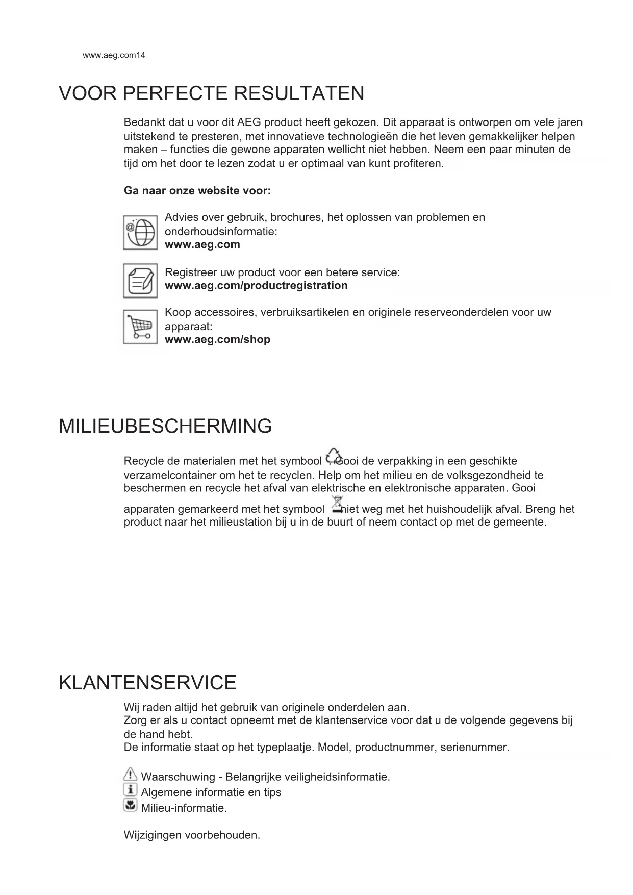Bedankt dat u voor dit AEG product heeft gekozen. Dit apparaat is ontworpen om vele jaren uitstekend te presteren, met innovatieve technologieën die het leven gemakkelijker helpen maken – functies die gewone apparaten wellicht niet hebben. Neem een paar minuten de tijd om het door te lezen zodat u er optimaal van kunt profiteren. Ga naar onze website voor: Advies over gebruik, brochures, het oplossen van problemen en onderhoudsinformatie: www.aeg.com Registreer uw product voor een betere service: www.aeg.com/productregistration Koop accessoires, verbruiksartikelen en originele reserveonderdelen voor uw apparaat: www.aeg.com/shop MILIEUBESCHERMING Recycle de materialen met het symbool . Gooi de verpakking in een geschikte verzamelcontainer om het te recyclen. Help om het milieu en de volksgezondheid te beschermen en recycle het afval van elektrische en elektronische apparaten. Gooi apparaten gemarkeerd met het symbool niet weg met het huishoudelijk afval. Breng het product naar het milieustation bij u in de buurt of neem contact op met de gemeente. KLANTENSERVICE Wij raden altijd het gebruik van originele onderdelen aan. Zorg er als u contact opneemt met de klantenservice voor dat u de volgende gegevens bij de hand hebt. De informatie staat op het typeplaatje. Model, productnummer, serienummer. Waarschuwing - Belangrijke veiligheidsinformatie. Algemene informatie en tips Milieu-informatie. Wijzigingen voorbehouden. NL GEBRUIKSAANWIJZING15 NEDERLANDS
