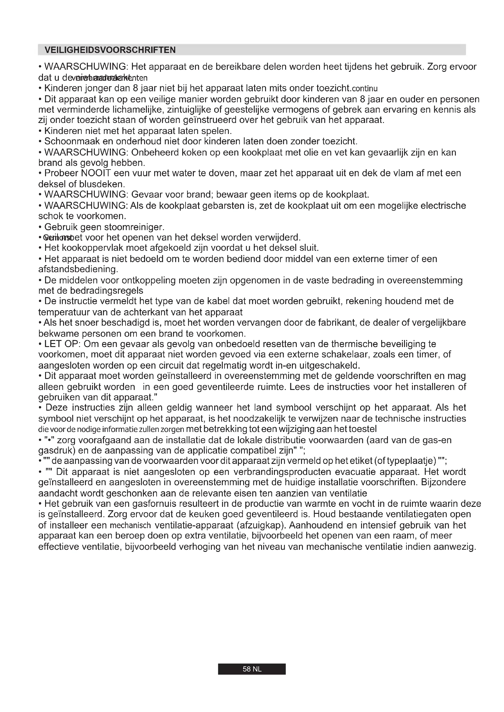 Dit apparaat is ontwikkeld en geproduceerd voor koken bij huishoudelijk gebruik. Elke andere vorm van gebruik is onjuist en derhalve gevaarlijk. De fabrikant kan niet aansprakelijk worden gesteld voor eventuele schade veroorzaakt door onjuist, onredelijk en onverantwoord gebruik. Kinderen jonger dan 8 jaar moeten op veilige afstand worden gehouden, tenzij continu bewaakt. Dit apparaat is niet bedoeld voor gebruik door personen (inclusief kinderen) met een lichamelijke, zintuiglijke of verstandelijke handicap of met een gebrek aan ervaring en kennis, tenzij ze zijn opgeleid en begeleid in het gebruik van het apparaat door een persoon die verantwoordelijk is voor hun veiligheid. Bij het koken met vet of olie, loop niet weg van de kookplaat. Oververhitte vetten of oliën kunnen snel ontbranden. Probeer nooit een brand met water te blussen, maar schakel eerst het uit entoestel bedek de vlam met een deksel of een branddeken. Tijdens de werking van de kookplaat, kunnen bereikbare delen zeer heet worden, dus het is aan te raden om jonge kinderen te verwijderen. Kinderen moeten onder toezicht worden gehouden zodat ze niet met het apparaat gaan spelen.