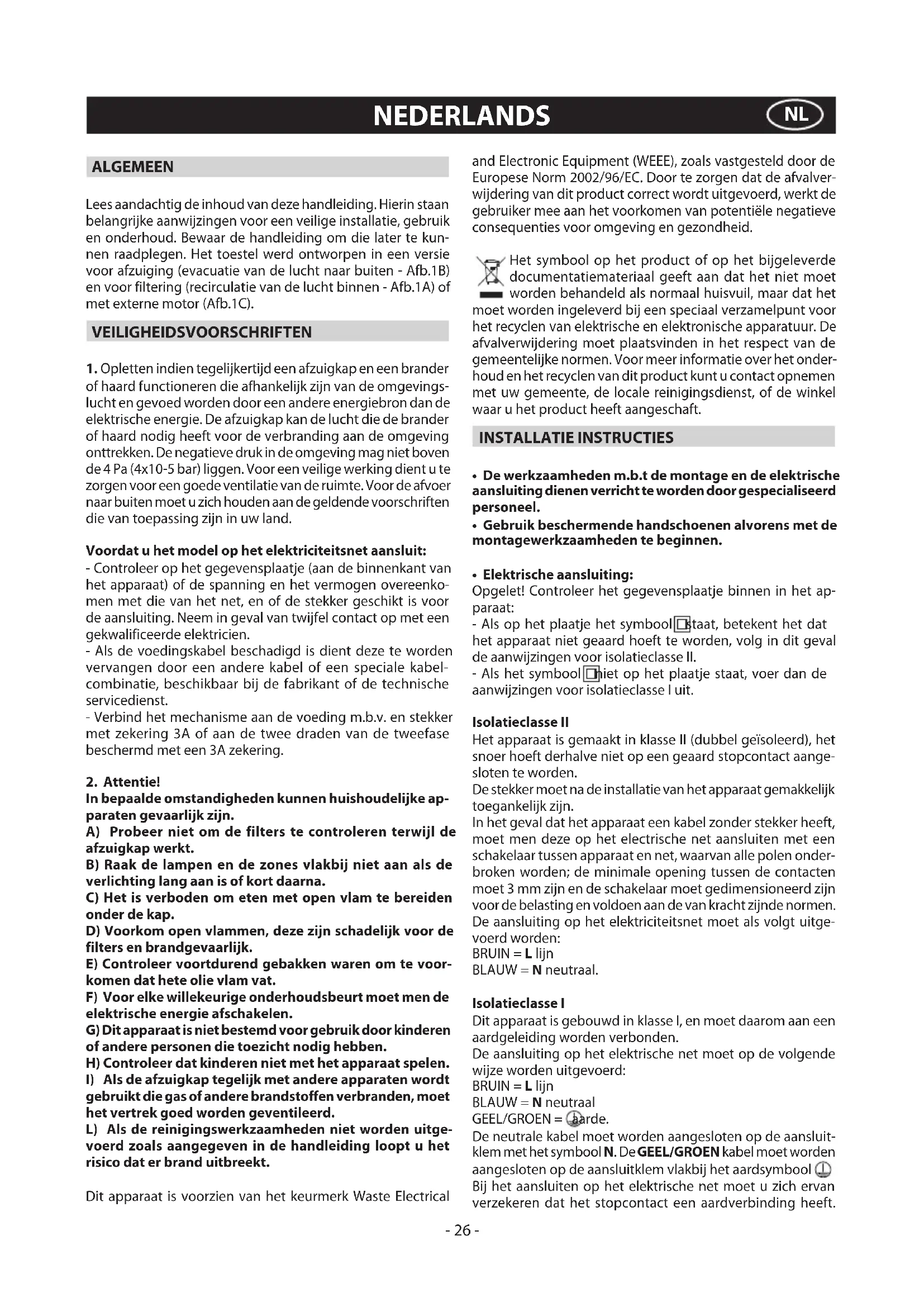 - Elektrischeaansluiting: Opgelet! Controleer het gegevensplaatje binnen in het ap- paraat: - Als op het plaatje het symbool staat, betekent het dat het apparaat niet geaard hoeft te worden, volg in dit geval de aanwijzingen voor isolatieclasse II. - Als het symbool niet op het plaatje staat, voer dan de aanwijzingen voor isolatieclasse I uit. Isolatieclasse II Het apparaat is gemaakt in klasse II (dubbel geïsoleerd), het snoer hoeft derhalve niet op een geaard stopcontact aange- sloten te worden. De stekker moet na de installatie van het apparaat gemakkelijk toegankelijk zijn. In het geval dat het apparaat een kabel zonder stekker heeft, moet men deze op het electrische net aansluiten met een schakelaar tussen apparaat en net, waarvan alle polen onder- broken worden; de minimale opening tussen de contacten moet 3 mm zijn en de schakelaar moet gedimensioneerd zijn voor de belasting en voldoen aan de van kracht zijnde normen. De aansluiting op het elektriciteitsnet moet als volgt uitge- voerd worden: BRUIN = L lijn BLAUW = N neutraal. Isolatieclasse I Dit apparaat is gebouwd in klasse I, en moet daarom aan een aardgeleiding worden verbonden. De aansluiting op het elektrische net moet op de volgende wijze worden uitgevoerd: BRUIN = L lijn BLAUW = N neutraal GEEL/GROEN = aarde. De neutrale kabel moet worden aangesloten op de aansluit- klem met het symbool N. De GEEL/GROEN kabel moet worden aangesloten op de aansluitklem vlakbij het aardsymbool . Bij het aansluiten op het elektrische net moet u zich ervan verzekeren dat het stopcontact een aardverbinding heeft.- 27 - Nadat u de afzuigkap heeft gemonteerd dient u ervoor te zorgen dat het stopcontact makkelijk te bereiken is. In het geval van een directe aansluiting op het elektrische net is het noodzakelijk tussen het apparaat en het net een meerpolige schakelaar aan te brengen met een minimum afstand van 3 mm tussen de contacten. Deze moet aangepast zijn aan het elektrische vermogen en voldoen aan de geldende normen.