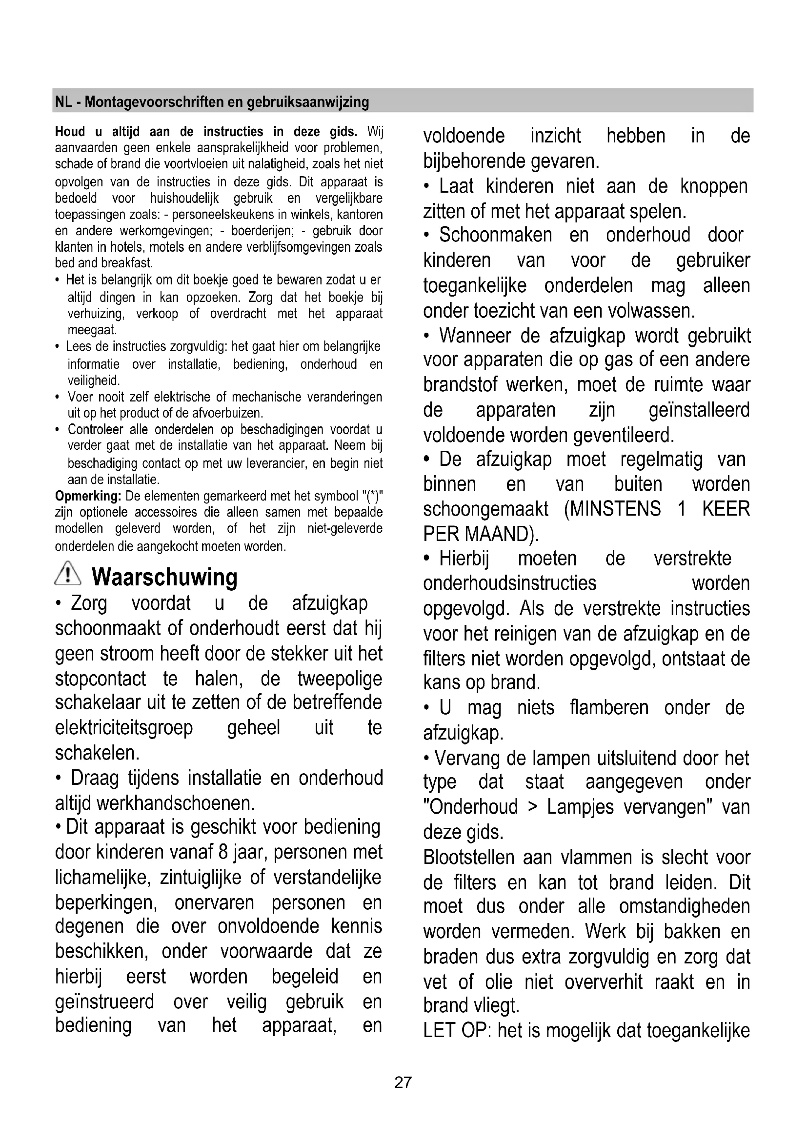 - De afzuigkap moet regelmatig van binnen en van buiten worden schoongemaakt (MINSTENS 1 KEER PER MAAND).