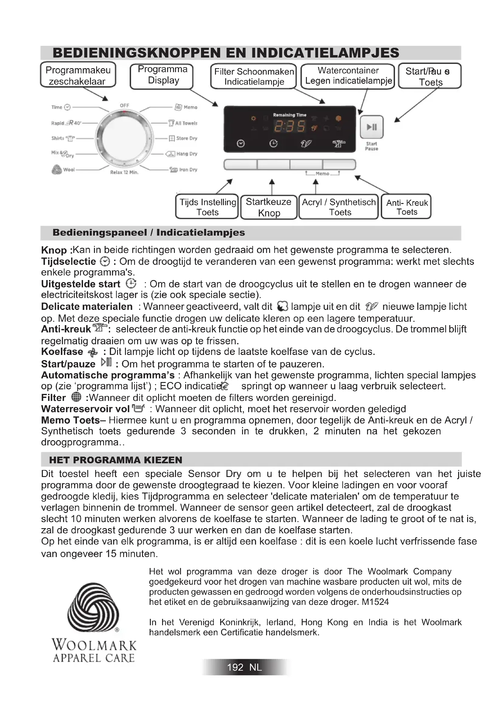 De weergegevenijd in het display kan wijzigen tijdens het drogen. De droogtijd wordt continue aangepast tijdens de cyclus en geeft een geschatteijd越. Deijd za tijdens het drogen Meer of minder worden dit is heel normal.
