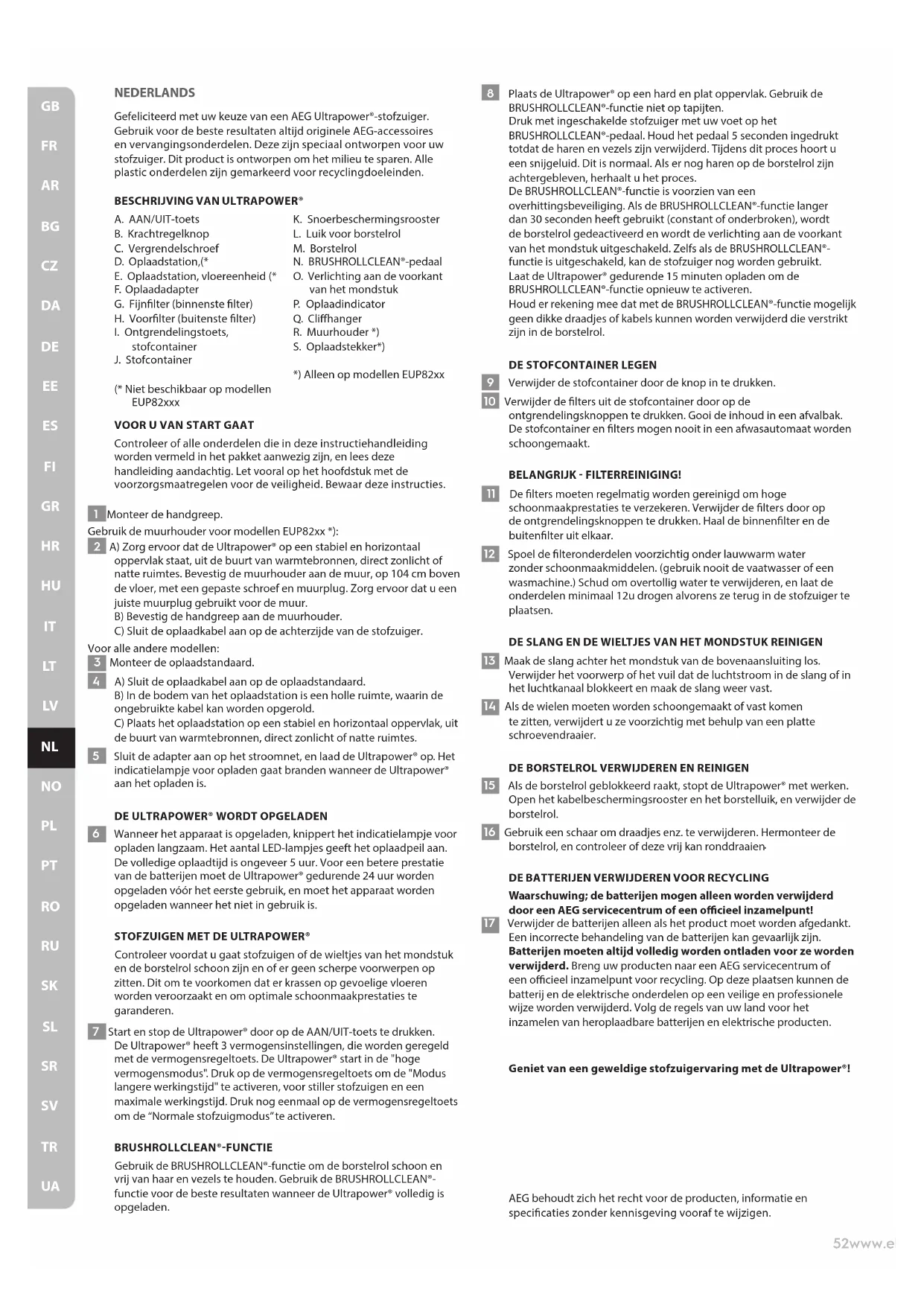 Waarschuwing; de batterijen mogen alleen worden verwijderd door een AEG servicecentrum of een ocieel inzamelpunt! 17 Verwijder de batterijen alleen als het product moet worden afgedankt. Een incorrecte behandeling van de batterijen kan gevaarlijk zijn. Batterijen moeten altijd volledig worden ontladen voor ze worden verwijderd. Breng uw producten naar een AEG servicecentrum of een ocieel inzamelpunt voor recycling. Op deze plaatsen kunnen de batterij en de elektrische onderdelen op een veilige en professionele wijze worden verwijderd. Volg de regels van uw land voor het inzamelen van heroplaadbare batterijen en elektrische producten. Geniet van een geweldige stofzuigervaring met de Ultrapower®!53www.electrolux.com