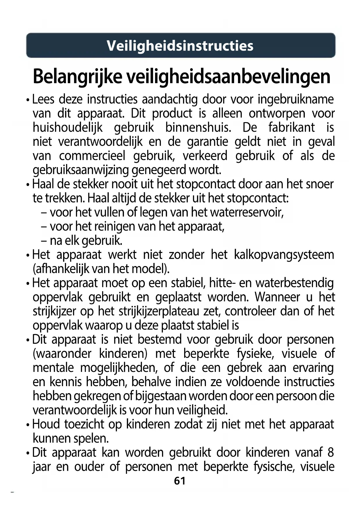 - Dit apparaat kan worden gebruikt door kinderen vanaf 8 jaar en ouder of personen met beperkte fysische, visuele Belangrijke veiligheidsaanbevelingen62 of mentale mogelijkheden, of die een gebrek hebben aan ervaring en kennis, als ze onder toezicht staan of instructies hebben gekregen over het veilig gebruik van het apparaat en de gevaren die het gebruik van het apparaat met zich meebrengt begrijpen. Kinderen mogen niet met dit apparaat spelen. Kinderen mogen het apparaat niet zonder toezicht reinigen of onderhouden. Houd het strijkijzer en snoer tijdens de werking of het afkoelen buiten het bereik van kinderen jonger dan 8 jaar.