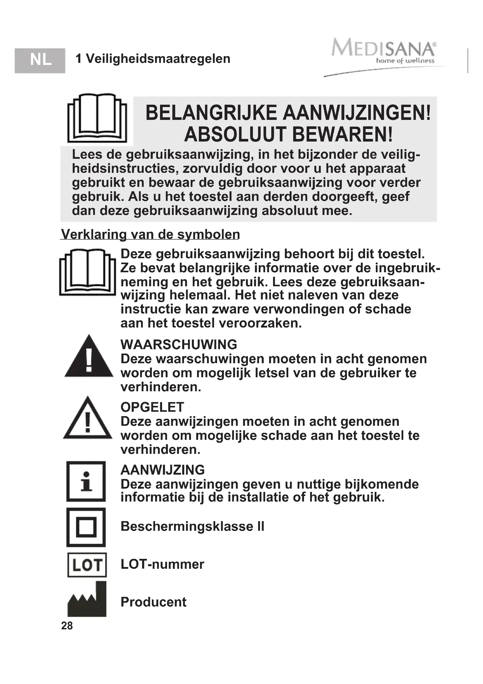 Deze gebruiksaanwijzing behoort bij dit toestel. Ze bevat belangrijke informatie over de ingebruik- neming en het gebruik. Lees deze gebruiksaan- wijzing helemaal. Het niet naleven van deze instructie kan zware verwondingen of schade aan het toestel veroorzaken. WAARSCHUWING Deze waarschuwingen moeten in acht genomen worden om mogelijk letsel van de gebruiker te verhinderen. OPGELET Deze aanwijzingen moeten in acht genomen worden om mogelijke schade aan het toestel te verhinderen. AANWIJZING Deze aanwijzingen geven u nuttige bijkomende informatie bij de installatie of het gebruik. Beschermingsklasse II Verklaring van de symbolen LOT-nummer