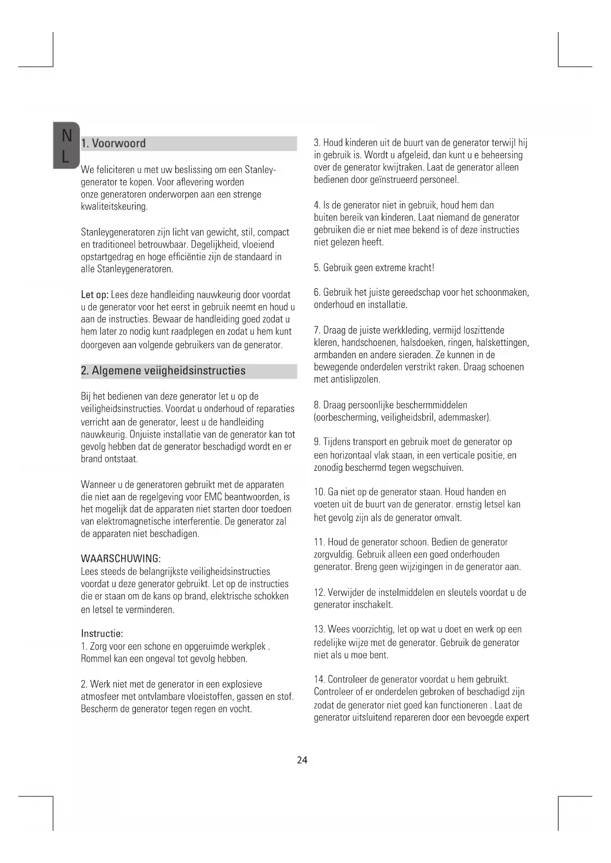 We feliciteren u met uw beslissing om een Stanley- generator te kopen. Voor aflevering worden onze generatoren onderworpen aan een strenge kwaliteitskeuring. Stanleygeneratoren zijn licht van gewicht, stil, compact en traditioneel betrouwbaar. Degelijkheid, vloeiend opstartgedrag en hoge efficiëntie zijn de standaard in alle Stanleygeneratoren. Let op: Lees deze handleiding nauwkeurig door voordat u de generator voor het eerst in gebruik neemt en houd u aan de instructies. Bewaar de handleiding goed zodat u hem later zo nodig kunt raadplegen en zodat u hem kunt doorgeven aan volgende gebruikers van de generator.