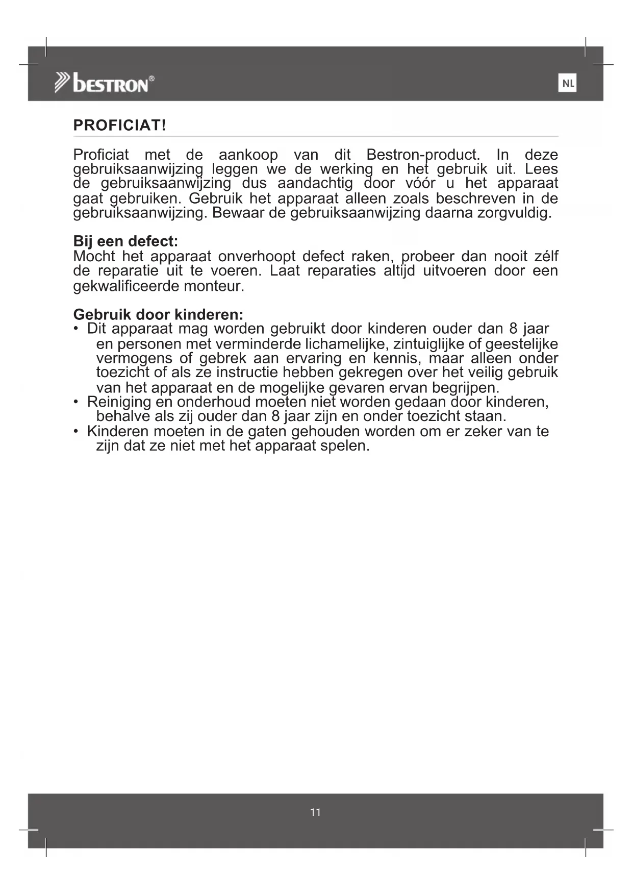 FRPROFICIAT! Proficiat met de aankoop van dit Bestron-product. In deze gebruiksaanwijzing leggen we de werking en het gebruik uit. Lees de gebruiksaanwijzing dus aandachtig door vóór u het apparaat gaat gebruiken. Gebruik het apparaat alleen zoals beschreven in de gebruiksaanwijzing. Bewaar de gebruiksaanwijzing daarna zorgvuldig. Bij een defect: Mocht het apparaat onverhoopt defect raken, probeer dan nooit zélf de reparatie uit te voeren. Laat reparaties altijd uitvoeren door een gekwalificeerde monteur. Gebruik door kinderen: