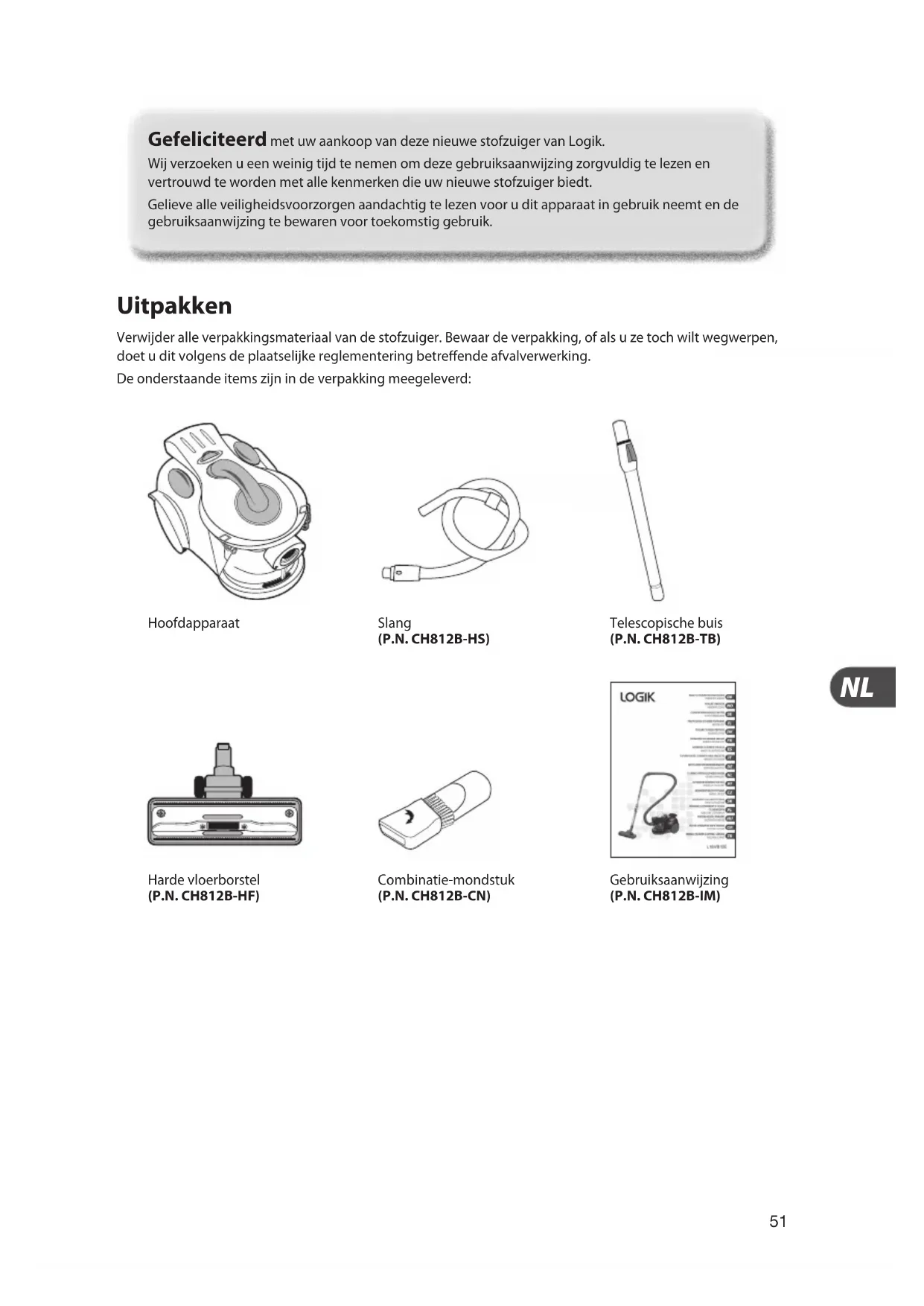 Uitpakken Verwijder alle verpakkingsmateriaal van de stofzuiger. Bewaar de verpakking, of als u ze toch wilt wegwerpen, doet u dit volgens de plaatselijke reglementering betreende afvalverwerking. De onderstaande items zijn in de verpakking meegeleverd: Gefeliciteerd met uw aankoop van deze nieuwe stofzuiger van Logik. Wij verzoeken u een weinig tijd te nemen om deze gebruiksaanwijzing zorgvuldig te lezen en vertrouwd te worden met alle kenmerken die uw nieuwe stofzuiger biedt. Gelieve alle veiligheidsvoorzorgen aandachtig te lezen voor u dit apparaat in gebruik neemt en de gebruiksaanwijzing te bewaren voor toekomstig gebruik. Hoofdapparaat Harde vloerborstel (P.N. CH812B-HF) Slang (P.N. CH812B-HS) Combinatie-mondstuk (P.N. CH812B-CN) Telescopische buis (P.N. CH812B-TB) Gebruiksaanwijzing (P.N. CH812B-IM)52