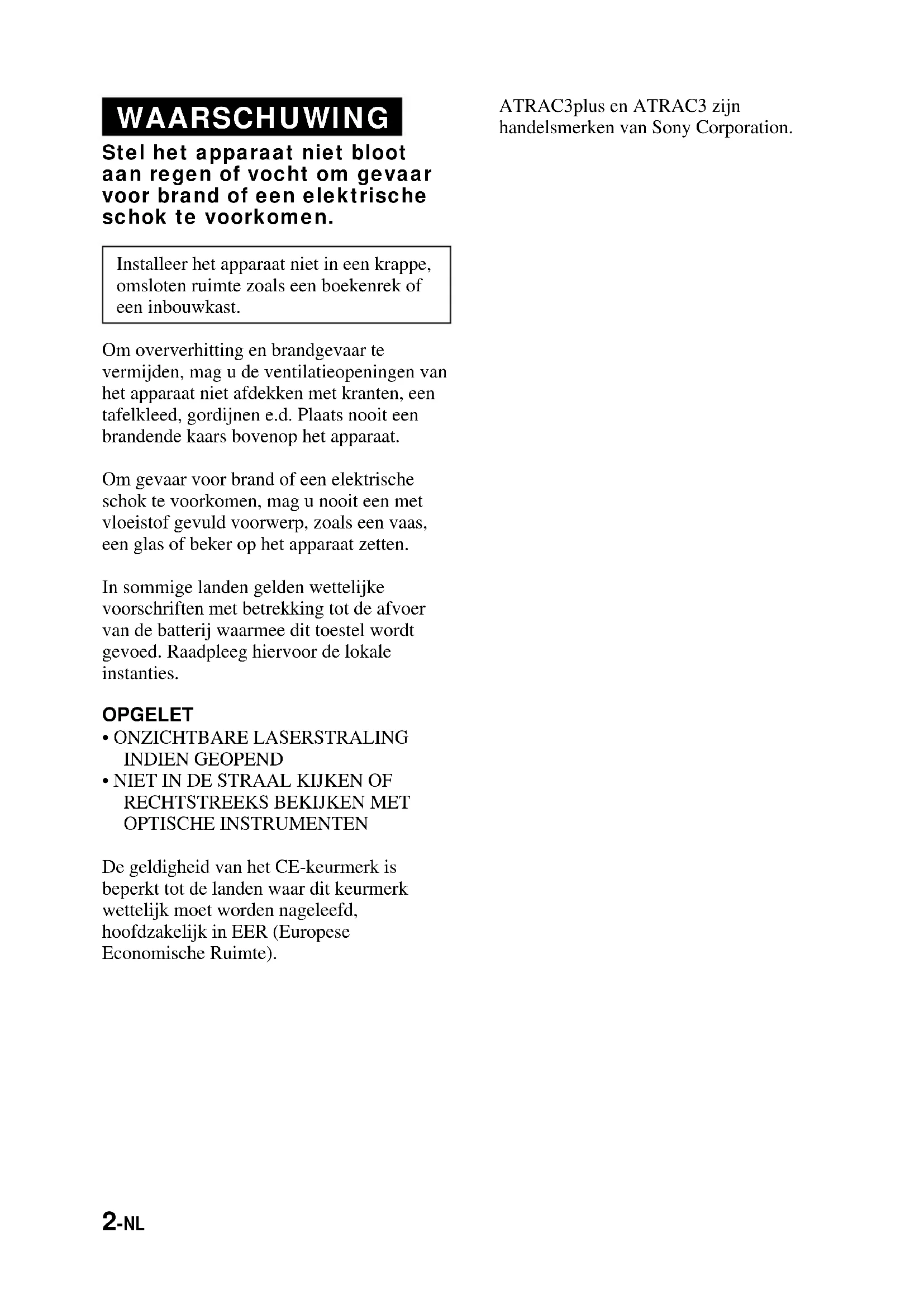 ⁄4 pouces) Masse (accessoires non compris) Env. 215 g (7,6 onces) Brevets américains et internationaux sous licence de Dolby Laboratories. La conception et les spécifications sont sujettes à modification sans préavis.37-FR2-NL ATRAC3plus en ATRAC3 zijn handelsmerken van Sony Corporation. WAARSCHUWING Stel het apparaat niet bloot aan regen of vocht om gevaar voor brand of een elektrische schok te voorkomen. Installeer het apparaat niet in een krappe, omsloten ruimte zoals een boekenrek of een inbouwkast. Om oververhitting en brandgevaar te vermijden, mag u de ventilatieopeningen van het apparaat niet afdekken met kranten, een tafelkleed, gordijnen e.d. Plaats nooit een brandende kaars bovenop het apparaat. Om gevaar voor brand of een elektrische schok te voorkomen, mag u nooit een met vloeistof gevuld voorwerp, zoals een vaas, een glas of beker op het apparaat zetten. In sommige landen gelden wettelijke voorschriften met betrekking tot de afvoer van de batterij waarmee dit toestel wordt gevoed. Raadpleeg hiervoor de lokale instanties. OPGELET