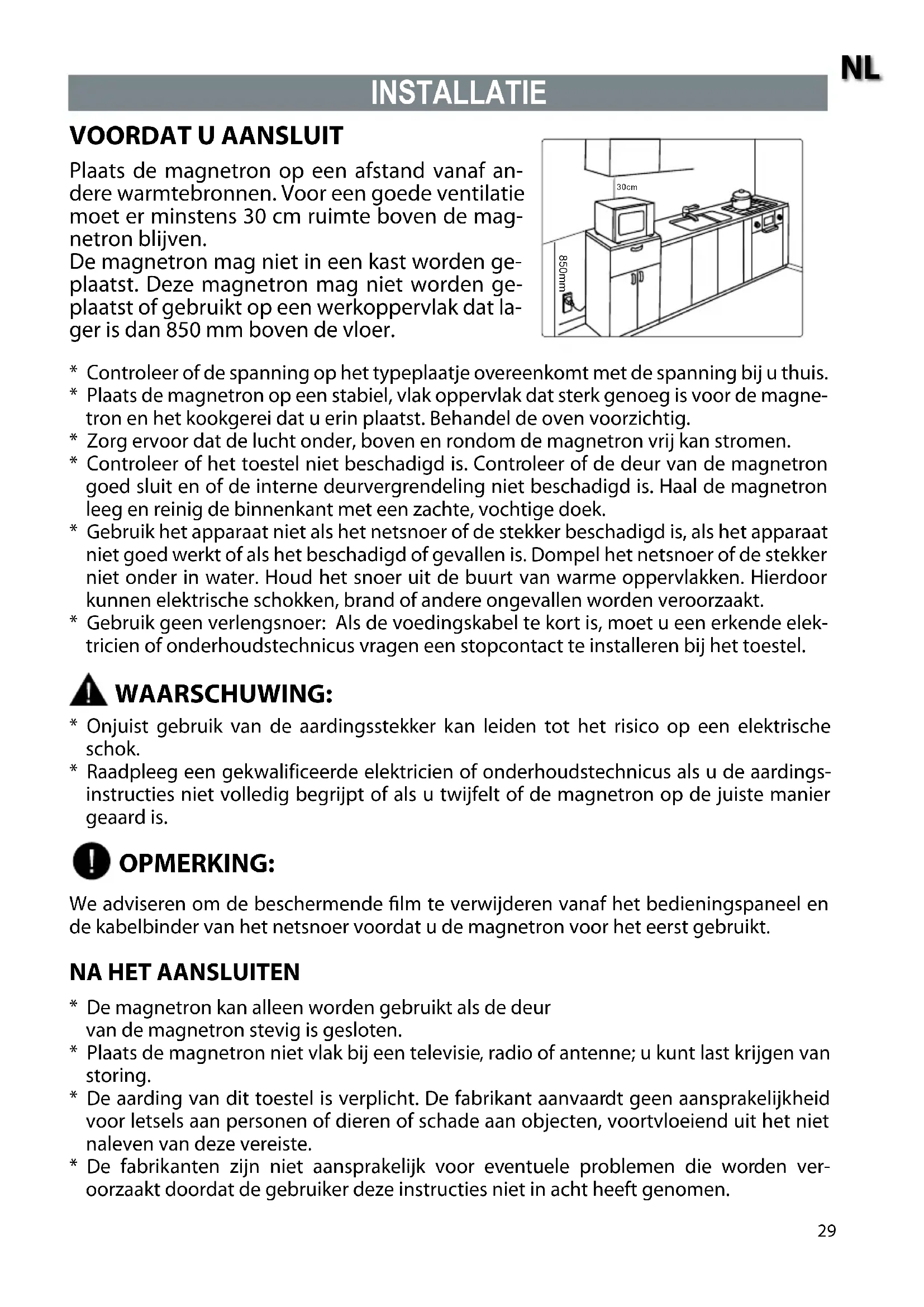 - Raadpleeg een gekwalificeerde elektricien of onderhoudstechnicus als u de aardings- instructies niet volledig begrijpt of als u twijfelt of de magnetron op de juiste manier geaard is.We adviseren om de beschermende lm te verwijderen vanaf het bedieningspaneel en de kabelbinder van het netsnoer voordat u de magnetron voor het eerst gebruikt. INSTALLATIE 850mm 30cm WAARSCHUWING: OPMERKING: