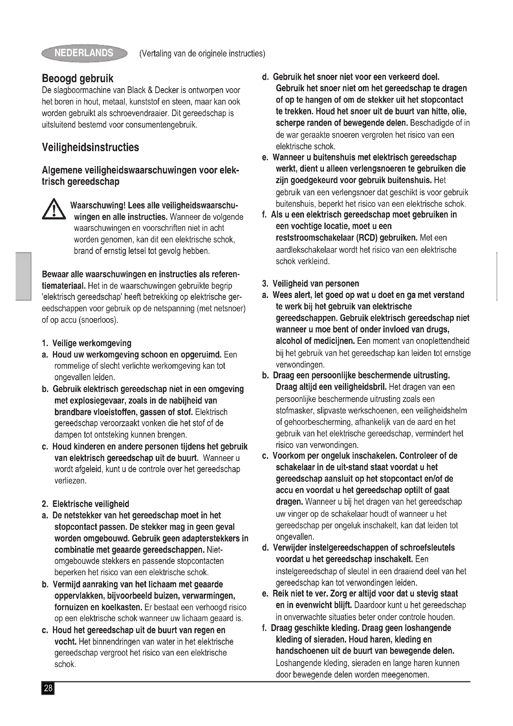 Kevin Hewitt Vice-President Global Engineering Black & Decker Europe, 210 Bath Road, Slough, Berkshire, SL1 3YD Verenigd Koninkrijk 18/02/2011 Garantie Black & Decker heeft vertrouwen in haar producten en biedt een uitstekende garantie. Deze garantiebepalingen vormen een aanvulling op uw wettelijke rechten en beperken deze niet. De garantie geldt in de lidstaten van de Europese Unie en de Europese Vrijhandelsassociatie. Mocht uw Black & Decker product binnen 24 maanden na de datum van aankoop defect raken ten gevolge van materi- aal- of constructiefouten, dan garanderen wij de kosteloze vervanging van defecte onderdelen, de reparatie van het product of de vervanging van het product, tenzij: u Het product is gebruikt voor handelsdoeleinden, profes- sionele toepassingen of verhuurdoeleinden. u Het product onoordeelkundig is gebruikt. u Het product is beschadigd door invloeden van buitenaf of door een ongeval. u Reparaties zijn uitgevoerd door anderen dan onze serv- icecentra of Black & Decker-personeel. Om een beroep te doen op de garantie, dient u een aank- oopbewijs te overhandigen aan de verkoper of een van onze servicecentra. U kunt het adres van het dichtstbijzijnde Black & Decker-servicecentrum opvragen via de adressen op de achterzijde van deze handleiding. U kunt ook een lijst van Black & Decker-servicecentra en meer informatie m.b.t. onze klantenservice vinden op internet op: www.2helpU.com Meld u aan op onze website www.blackanddecker.nl om te worden geïnformeerd over nieuwe producten en speciale aan- biedingen. Verdere informatie over het merk Black & Decker en onze producten vindt u op www.blackanddecker.nl.34 (Traducción de las instrucciones originales) ESPAÑOL Uso especíco Su taladro de percusión Black & Decker está diseñado para taladrar madera, metal, plásticos y mampostería, así como para atornillar. Esta herramienta está pensada únicamente para uso doméstico. Instrucciones de seguridad Advertencias de seguridad generales para herrami- entas eléctricas