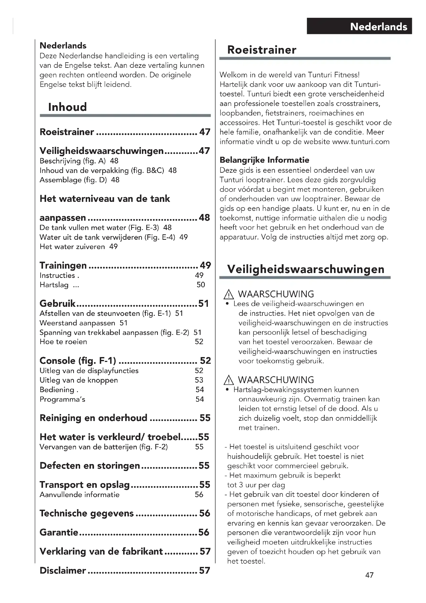 - Hartslag-bewakingssystemen kunnen onnauwkeurig zijn. Overmatig trainen kan leiden tot ernstig letsel of de dood. Als u zich duizelig voelt, stop dan onmiddellijk met trainen. - Het toestel is uitsluitend geschikt voor huishoudelijk gebruik. Het toestel is niet geschikt voor commercieel gebruik. - Het maximum gebruik is beperkt tot 3 uur per dag - Het gebruik van dit toestel door kinderen of personen met fysieke, sensorische, geestelijke of motorische handicaps, of met gebrek aan ervaring en kennis kan gevaar veroorzaken. De personen die verantwoordelijk zijn voor hun veiligheid moeten uitdrukkelijke instructies geven of toezicht houden op het gebruik van het toestel. Nederlands Deze Nederlandse handleiding is een vertaling van de Engelse tekst. Aan deze vertaling kunnen geen rechten ontleend worden. De originele Engelse tekst blijft leidend. Inhoud Roeistrainer .................................... 47 Veiligheidswaarschuwingen ............ 47 Beschrijving (g. A) 48 Inhoud van de verpakking (g. B&C) 48 Assemblage (g. D) 48 Het waterniveau van de tank aanpassen ....................................... 48 De tank vullen met water (Fig. E-3) 48 Water uit de tank verwijderen (Fig. E-4) 49 Het water zuiveren 49 Trainingen ....................................... 49 Instructies . 49 Hartslag ... 50 Gebruik ........................................... 51 Afstellen van de steunvoeten (g. E-1) 51 Weerstand aanpassen 51 Spanning van trekkabel aanpassen (g. E-2) 51 Hoe te roeien 52 Console (g. F-1) ............................ 52 Uitleg van de displayfuncties 52 Uitleg van de knoppen 53 Bediening . 54 Programma’s 54 Reiniging en onderhoud ................. 55 Het water is verkleurd/ troebel. ..... 55 Vervangen van de batterijen (g. F-2) 55 Defecten en storingen .................... 55 Transport en opslag ........................ 55 Aanvullende informatie 56 Technische gegevens ...................... 56 Garantie .......................................... 56 Verklaring van de fabrikant ............ 57 Disclaimer ....................................... 5748 Nederlands - Laat uw gezondheid door een arts controleren voordat u met uw training begint. - Als u misselijkheid, duizeligheid of andere abnormale symptomen ervaart, stop dan onmiddellijk met uw training en raadpleeg een arts. - Om spierpijn en te zware belasting te voorkomen, moet u elke training beginnen met een warming-up en eindigen met een cooling- down. Vergeet niet om uw spieren te strekken aan het einde van de training. - Het toestel is uitsluitend geschikt voor gebruik binnenshuis. Het toestel is niet geschikt voor gebruik buitenshuis. - Gebruik het toestel alleen in een omgeving met voldoende ventilatie. Gebruik het toestel niet in een tochtige omgeving om geen kou te vatten. - Gebruik het toestel alleen in een omgeving met een omgevingstemperatuur tussen 10 °C en 35 °C. Berg het toestel alleen op bij een omgevingstemperatuur tussen 5 °C en 45 °C. - Gebruik het toestel niet in een vochtige omgeving. Berg het toestel niet op in een vochtige omgeving. De luchtvochtigheid mag nooit meer zijn dan 80%. - Gebruik het toestel alleen voor het doel waarvoor het gemaakt is. Gebruik het toestel niet voor andere doelstellingen dan beschreven in de handleiding. - Gebruik het toestel niet als een onderdeel is beschadigd of niet goed werkt. Raadpleeg uw dealer als een onderdeel is beschadigd of niet goed werkt. - Houd uw handen, voeten en andere lichaamsdelen uit de buurt van de bewegende delen. - Houd uw haar uit de buurt van de bewegende delen. - Draag geschikte kleding en schoenen. - Houd kleding, sieraden en andere voorwerpen uit de buurt van de bewegende delen. - Zorg ervoor dat het toestel slechts door één persoon tegelijk wordt gebruikt. Het toestel mag niet worden gebruikt door personen die meer dan 150 kg (330 lbs) wegen. - Maak het toestel niet open zonder eerst uw dealer te raadplegen. Beschrijving (fig. A) Uw roeitrainer is een stationair fitnesstoestel dat wordt gebruikt voor het nabootsen van roeien zonder dat de gewrichten te veel belast worden. Inhoud van de verpakking (fig. B&C) - De verpakking bevat de onderdelen zoals aangegeven in fig. B. - De verpakking bevat de bevestigingsmiddelen zoals aangegeven in fig. C. Raadpleeg het gedeelte “Beschrijving”. ‼ LET OP