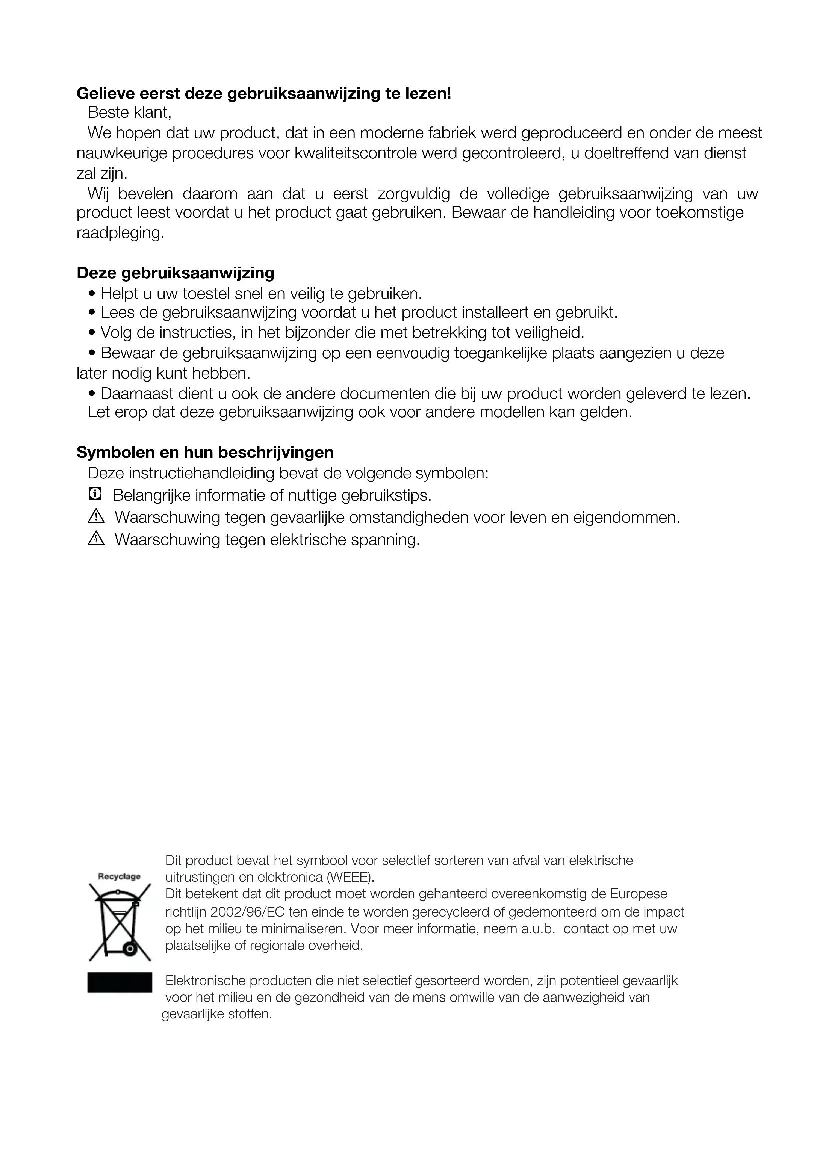 - Bewaar de gebruiksaanwijzing op een eenvoudig toegankelijke plaats aangezien u deze later nodig kunt hebben.