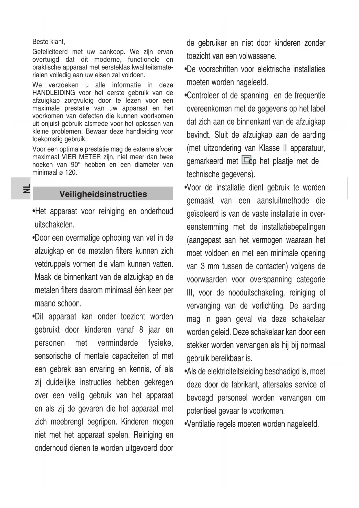 Beste klant, Gefeliciteerd met uw aankoop. We zijn ervan overtuigd dat dit moderne, functionele en praktische apparaat met eersteklas kwaliteitsmate- rialen volledig aan uw eisen zal voldoen. We verzoeken u alle informatie in deze HANDLEIDING voor het eerste gebruik van de afzuigkap zorgvuldig door te lezen voor een maximale prestatie van uw apparaat en het voorkomen van defecten die kunnen voortkomen uit onjuist gebruik alsmede voor het oplossen van kleine problemen. Bewaar deze handleiding voor toekomstig gebruik. Voor een optimale prestatie mag de externe afvoer maximaal VIER METER zijn, niet meer dan twee hoeken van 90° hebben en een diameter van minimaal ø 120.