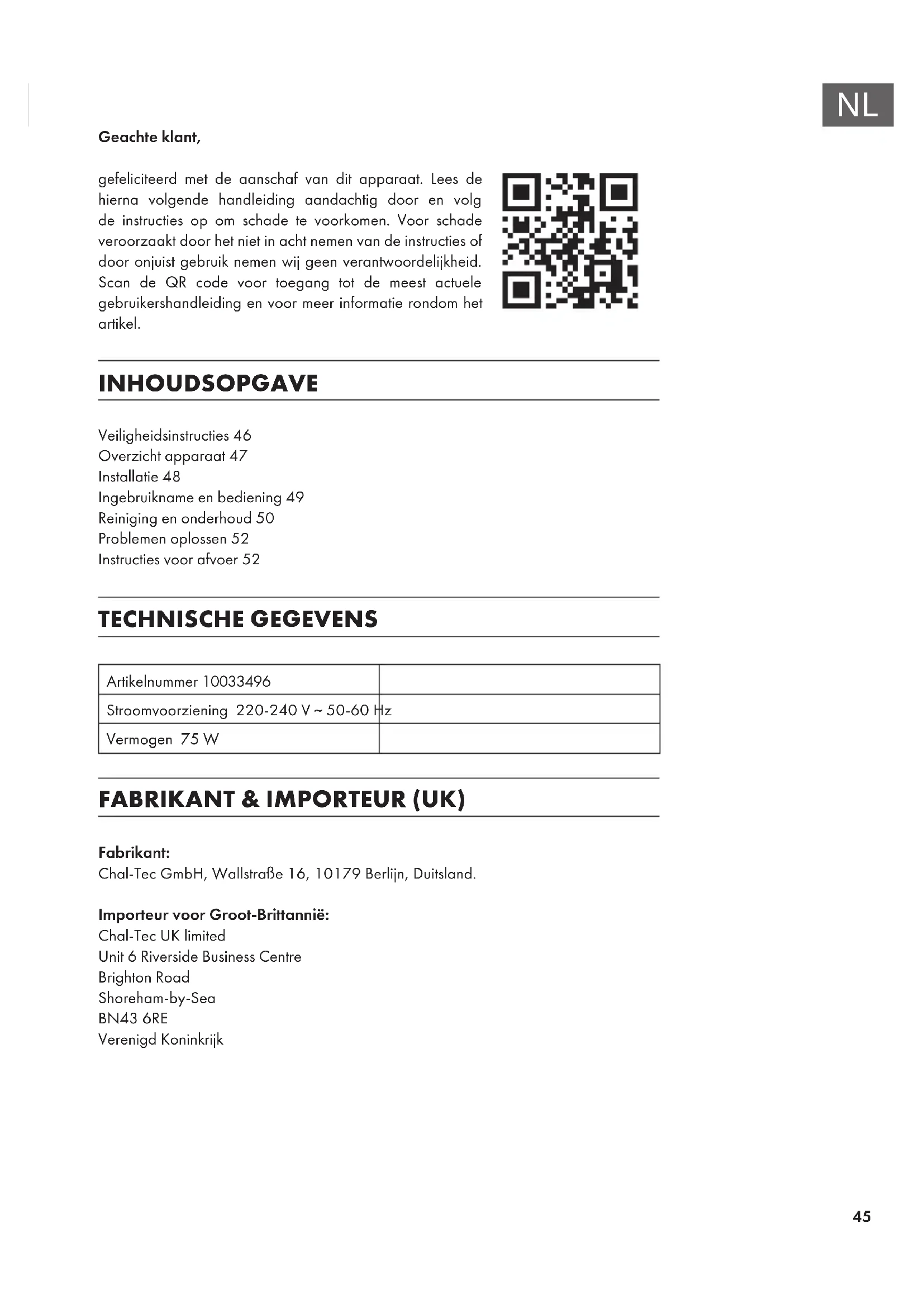 Geachte klant, gefeliciteerd met de aanschaf van dit apparaat. Lees de hierna volgende handleiding aandachtig door en volg de instructies op om schade te voorkomen. Voor schade veroorzaakt door het niet in acht nemen van de instructies of door onjuist gebruik nemen wij geen verantwoordelijkheid. Scan de QR code voor toegang tot de meest actuele gebruikershandleiding en voor meer informatie rondom het artikel. INHOUDSOPGAVE Veiligheidsinstructies46 Overzicht apparaat47 Installatie48 Ingebruikname en bediening49 Reiniging en onderhoud50 Problemen oplossen52 Instructies voor afvoer52 TECHNISCHE GEGEVENS Artikelnummer 10033496 Stroomvoorziening 220-240 V ~ 50-60 Hz Vermogen 75 W FABRIKANT & IMPORTEUR (UK) Fabrikant: Chal-Tec GmbH, Wallstraße 16, 10179 Berlijn, Duitsland. Importeur voor Groot-Brittannië: Chal-Tec UK limited Unit 6 Riverside Business Centre Brighton Road Shoreham-by-Sea BN43 6RE Verenigd Koninkrijk46