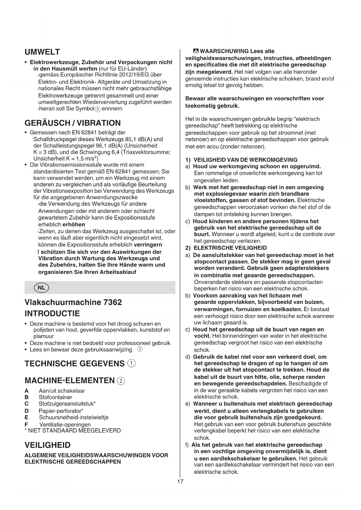 können Sie die gewünschte Schleifgeschwindigkeit einstellen17 - WAARSCHUWING Lees alle veiligheidswaarschuwingen, instructies, afbeeldingen en specicaties die met dit elektrische gereedschap zijn meegeleverd. Het niet volgen van alle hieronder genoemde instructies kan elektrische schokken, brand en/of ernstig letsel tot gevolg hebben. Bewaar alle waarschuwingen en voorschriften voor toekomstig gebruik. Het in de waarschuwingen gebruikte begrip “elektrisch gereedschap” heeft betrekking op elektrische gereedschappen voor gebruik op het stroomnet (met netsnoer) en op elektrische gereedschappen voor gebruik met een accu (zonder netsnoer).