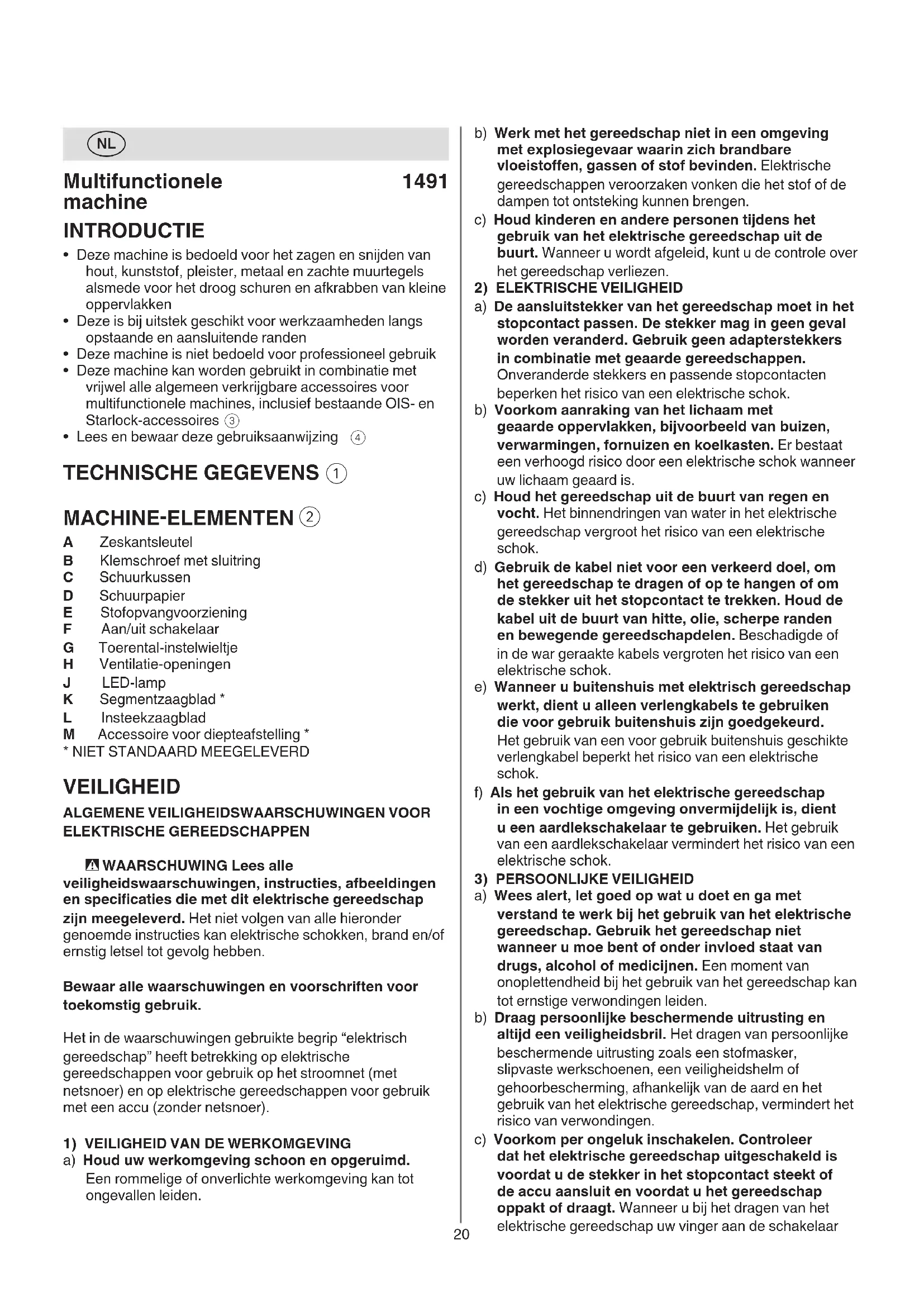 ELEKTRISCHE GEREEDSCHAPPEN - WAARSCHUWING Lees alle veiligheidswaarschuwingen, instructies, afbeeldingen en specicaties die met dit elektrische gereedschap zijn meegeleverd. Het niet volgen van alle hieronder genoemde instructies kan elektrische schokken, brand en/of ernstig letsel tot gevolg hebben. Bewaar alle waarschuwingen en voorschriften voor toekomstig gebruik. Het in de waarschuwingen gebruikte begrip “elektrisch gereedschap” heeft betrekking op elektrische gereedschappen voor gebruik op het stroomnet (met netsnoer) en op elektrische gereedschappen voor gebruik met een accu (zonder netsnoer).