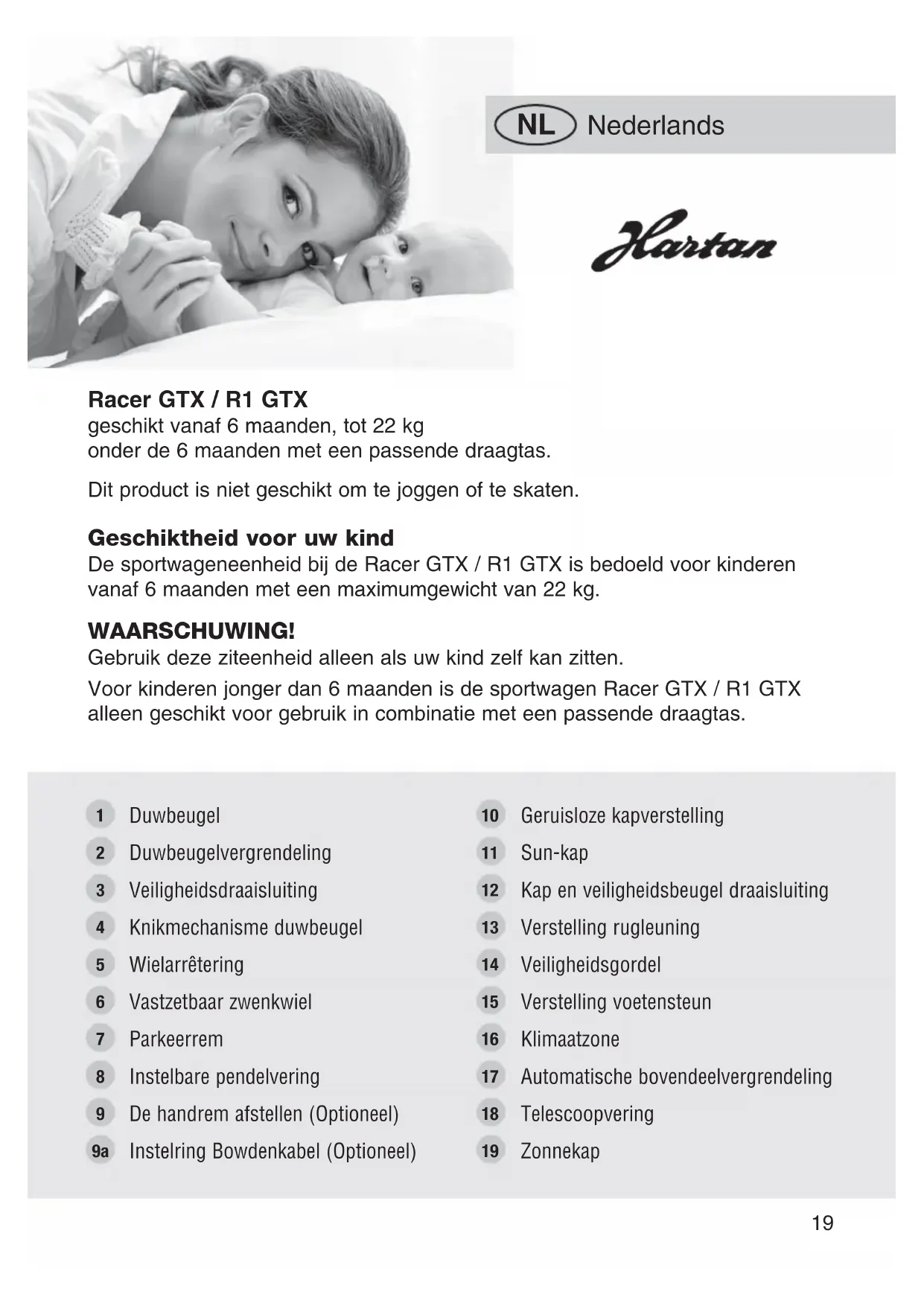 Geschiktheid voor uw kind De sportwageneenheid bij de Racer GTX / R1 GTX is bedoeld voor kinderen vanaf 6 maanden met een maximumgewicht van 22 kg. WAARSCHUWING! Gebruik deze ziteenheid alleen als uw kind zelf kan zitten. Voor kinderen jonger dan 6 maanden is de sportwagen Racer GTX / R1 GTX alleen geschikt voor gebruik in combinatie met een passende draagtas. Racer GTX / R1 GTX geschikt vanaf 6 maanden, tot 22 kg onder de 6 maanden met een passende draagtas. Dit product is niet geschikt om te joggen of te skaten. Duwbeugel Duwbeugelvergrendeling Veiligheidsdraaisluiting Knikmechanisme duwbeugel Wielarrêtering Vastzetbaar zwenkwiel Parkeerrem Instelbare pendelvering De handrem afstellen (Optioneel) Instelring Bowdenkabel (Optioneel) Geruisloze kapverstelling Sun-kap Kap en veiligheidsbeugel draaisluiting Verstelling rugleuning Veiligheidsgordel Verstelling voetensteun Klimaatzone Automatische bovendeelvergrendeling Telescoopvering Zonnekap
