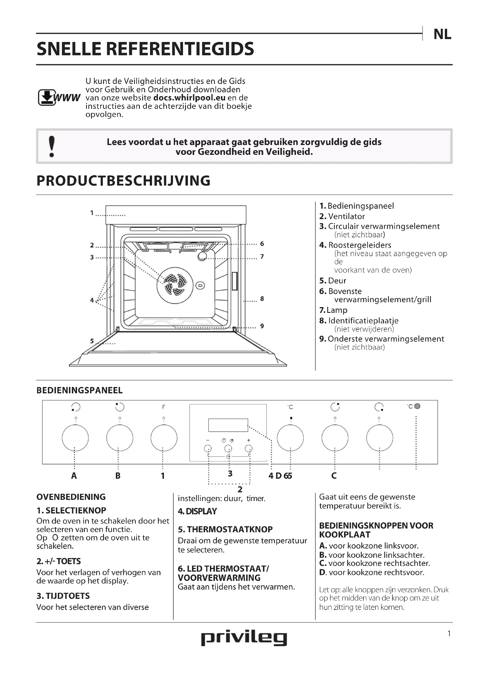 VOORVERWARMING Gaat aan tijdens het verwarmen. aat uit eens de gewenste temperatuur bereikt is. BEDIENINGSKNOPPEN VOOR KOOKPLAAT A. voor kookzone linksvoor.B. voor kookzone linksachter.C. voor kookzone rechtsachter.D. voor kookzone rechtsvoor.Let op: alle knoppen zijn verzonken. Druk op het midden van de knop om ze uit hun zitting te laten komen. SNELLE REFERENTIEGIDS Lees voordat u het apparaat gaat gebruiken zorgvuldig de gids voor Gezondheid en Veiligheid. WWW U kunt de Veiligheidsinstructies en de Gids voor Gebruik en Onderhoud downloaden van onze website docs.whirlpool.eu en de instructies aan de achterzijde van dit boekje opvolgen.