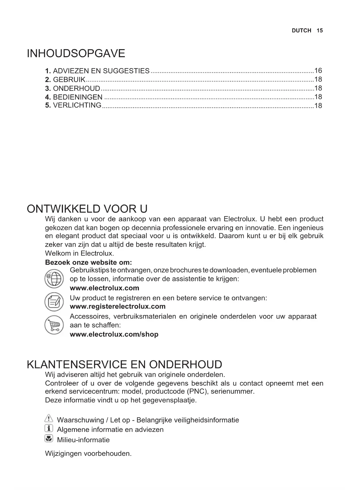 Wij adviseren altijd het gebruik van originele onderdelen. Controleer of u over de volgende gegevens beschikt als u contact opneemt met een erkend servicecentrum: model, productcode (PNC), serienummer. Deze informatie vindt u op het gegevensplaatje. Waarschuwing / Let op - Belangrijke veiligheidsinformatie Algemene informatie en adviezen Milieu-informatie Wijzigingen voorbehouden.16 www.electrolux.com