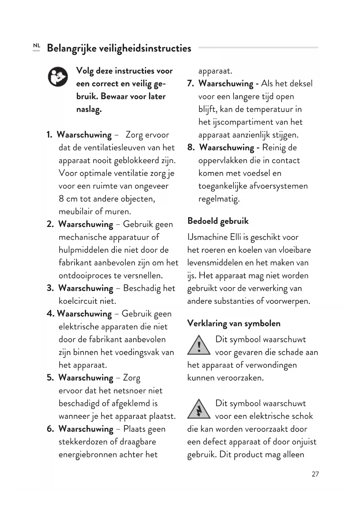 - De ijsmaker is uitsluitend geschikt voor het bereiden van ijs, sorbet en frozen yoghurt. Het is niet bedoeld voor andere levensmiddelen. - Bewaar het apparaat buiten het bereik van kinderen.