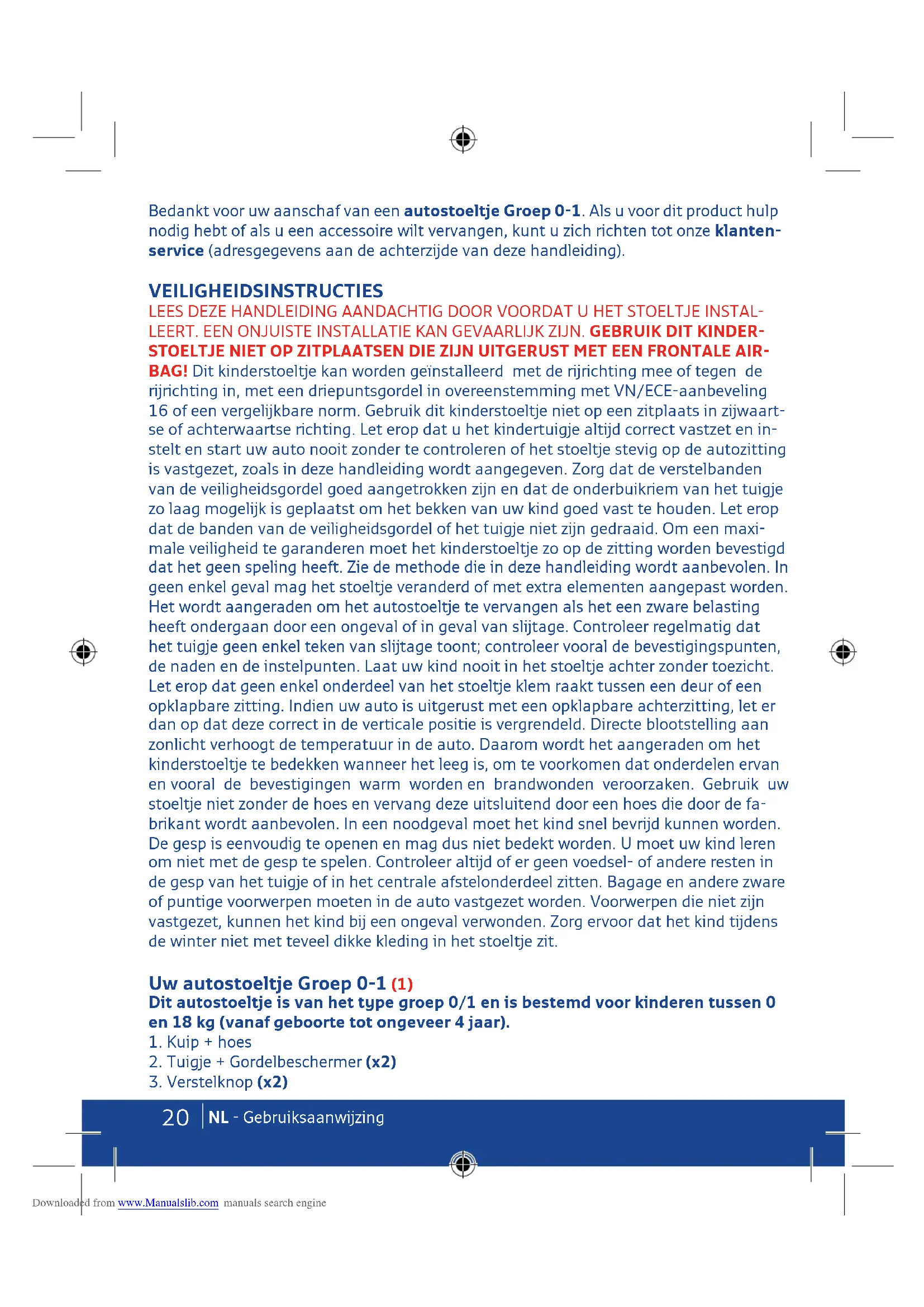 - Wenden Sie sich in Zweifelsfällen an den Hersteller des Rückhaltesystems oder an Ihren Händler. Downloaded from www.Manualslib.com manuals search engine20 NL - Gebruiksaanwijzing Bedankt voor uw aanschaf van een autostoeltje Groep 0-1. Als u voor dit product hulp nodig hebt of als u een accessoire wilt vervangen, kunt u zich richten tot onze klanten- service (adresgegevens aan de achterzijde van deze handleiding). VEILIGHEIDSINSTRUCTIES LEES DEZE HANDLEIDING AANDACHTIG DOOR VOORDAT U HET STOELTJE INSTAL- LEERT. EEN ONJUISTE INSTALLATIE KAN GEVAARLIJK ZIJN. GEBRUIK DIT KINDER- STOELTJE NIET OP ZITPLAATSEN DIE ZIJN UITGERUST MET EEN FRONTALE AIR- BAG! Dit kinderstoeltje kan worden geïnstalleerd met de rijrichting mee of tegen de rijrichting in, met een driepuntsgordel in overeenstemming met VN/ECE-aanbeveling 16 of een vergelijkbare norm. Gebruik dit kinderstoeltje niet op een zitplaats in zijwaart- se of achterwaartse richting. Let erop dat u het kindertuigje altijd correct vastzet en in- stelt en start uw auto nooit zonder te controleren of het stoeltje stevig op de autozitting is vastgezet, zoals in deze handleiding wordt aangegeven. Zorg dat de verstelbanden van de veiligheidsgordel goed aangetrokken zijn en dat de onderbuikriem van het tuigje zo laag mogelijk is geplaatst om het bekken van uw kind goed vast te houden. Let erop dat de banden van de veiligheidsgordel of het tuigje niet zijn gedraaid. Om een maxi- male veiligheid te garanderen moet het kinderstoeltje zo op de zitting worden bevestigd dat het geen speling heeft. Zie de methode die in deze handleiding wordt aanbevolen. In geen enkel geval mag het stoeltje veranderd of met extra elementen aangepast worden. Het wordt aangeraden om het autostoeltje te vervangen als het een zware belasting heeft ondergaan door een ongeval of in geval van slijtage. Controleer regelmatig dat het tuigje geen enkel teken van slijtage toont; controleer vooral de bevestigingspunten, de naden en de instelpunten. Laat uw kind nooit in het stoeltje achter zonder toezicht. Let erop dat geen enkel onderdeel van het stoeltje klem raakt tussen een deur of een opklapbare zitting. Indien uw auto is uitgerust met een opklapbare achterzitting, let er dan op dat deze correct in de verticale positie is vergrendeld. Directe blootstelling aan zonlicht verhoogt de temperatuur in de auto. Daarom wordt het aangeraden om het kinderstoeltje te bedekken wanneer het leeg is, om te voorkomen dat onderdelen ervan en vooral de bevestigingen warm worden en brandwonden veroorzaken. Gebruik uw stoeltje niet zonder de hoes en vervang deze uitsluitend door een hoes die door de fa- brikant wordt aanbevolen. In een noodgeval moet het kind snel bevrijd kunnen worden. De gesp is eenvoudig te openen en mag dus niet bedekt worden. U moet uw kind leren om niet met de gesp te spelen. Controleer altijd of er geen voedsel- of andere resten in de gesp van het tuigje of in het centrale afstelonderdeel zitten. Bagage en andere zware of puntige voorwerpen moeten in de auto vastgezet worden. Voorwerpen die niet zijn vastgezet, kunnen het kind bij een ongeval verwonden. Zorg ervoor dat het kind tijdens de winter niet met teveel dikke kleding in het stoeltje zit. Uw autostoeltje Groep 0-1 (1) Dit autostoeltje is van het type groep 0/1 en is bestemd voor kinderen tussen 0 en 18 kg (vanaf geboorte tot ongeveer 4 jaar).