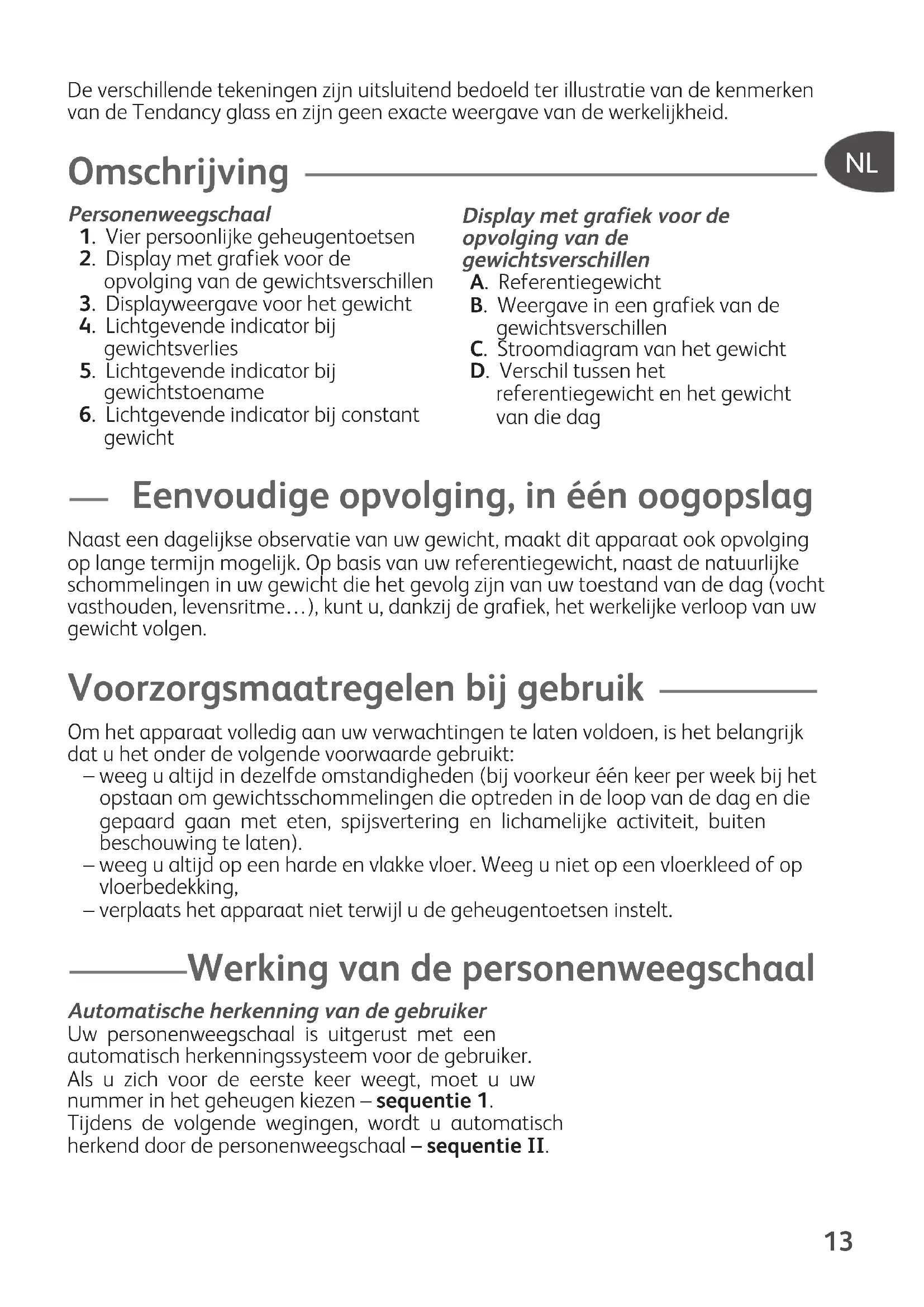 Participons à la protection de l’environnement ! Votre appareil contient de nombreux matériaux valorisables ou recyclables. Confiez celui-ci dans un point de collecte ou à défaut dans un centre de service agréé pour que son traitement soit effectué. ...De verschillende tekeningen zijn uitsluitend bedoeld ter illustratie van de kenmerkenvan de Tendancy glass en zijn geen exacte weergave van de werkelijkheid. Omschrijving Personenweegschaal 1. Vier persoonlijke geheugentoetsen2. Display met grafiek voor de opvolging van de gewichtsverschillen3. Displayweergave voor het gewicht4. Lichtgevende indicator bij gewichtsverlies5. Lichtgevende indicator bij gewichtstoename6. Lichtgevende indicator bij constant gewicht Eenvoudige opvolging, in één oogopslag Naast een dagelijkse observatie van uw gewicht, maakt dit apparaat ook opvolgingop lange termijn mogelijk. Op basis van uw referentiegewicht, naast de natuurlijkeschommelingen in uw gewicht die het gevolg zijn van uw toestand van de dag (vochtvasthouden, levensritme…), kunt u, dankzij de grafiek, het werkelijke verloop van uwgewicht volgen. Voorzorgsmaatregelen bij gebruik Om het apparaat volledig aan uw verwachtingen te laten voldoen, is het belangrijkdat u het onder de volgende voorwaarde gebruikt:– weeg u altijd in dezelfde omstandigheden (bij voorkeur één keer per week bij hetopstaan om gewichtsschommelingen die optreden in de loop van de dag en diegepaard gaan met eten, spijsvertering en lichamelijke activiteit, buitenbeschouwing te laten).– weeg u altijd op een harde en vlakke vloer. Weeg u niet op een vloerkleed of opvloerbedekking,– verplaats het apparaat niet terwijl u de geheugentoetsen instelt. Werking van de personenweegschaal Automatische herkenning van de gebruiker Uw personenweegschaal is uitgerust met eenautomatisch herkenningssysteem voor de gebruiker.Als u zich voor de eerste keer weegt, moet u uwnummer in het geheugen kiezen – sequentie 1.Tijdens de volgende wegingen, wordt u automatischherkend door de personenweegschaal – sequentie II. Display met grafiek voor de opvolging van de gewichtsverschillen A. ReferentiegewichtB. Weergave in een grafiek van de gewichtsverschillenC. Stroomdiagram van het gewichtD. Verschil tussen het referentiegewicht en het gewicht van die dag